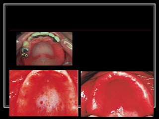 Denture Induced Stomatitis, also known as denture sore mouth, is a common condition affecting up to 70% of denture wearers, characterized by erythema and swelling of the palate mucosa in contact with the dentures. It is caused mainly by Candida albicans accumulating on dentures due to poor oral and denture hygiene. Treatment involves improving hygiene, removing dental plaque from dentures and mucosa, and using antifungal medications like nystatin drops or miconazole gel.