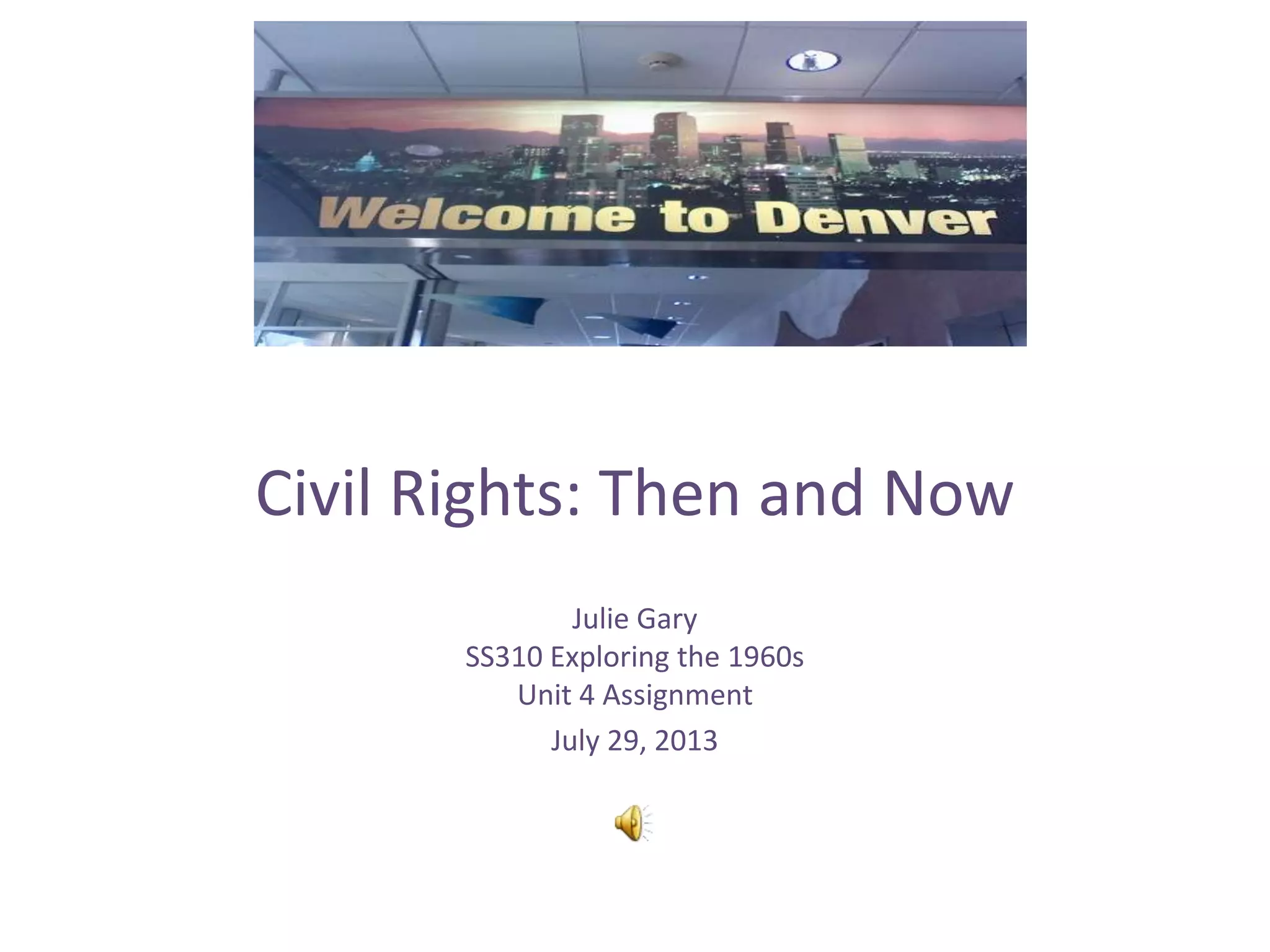 This document summarizes how civil rights have progressed in Denver, Colorado from the 1960s to present day. In the 1960s, services and facilities were often segregated by race and disability. Now, there is more evidence of integrated participation across politics, business, education and culture. Mile High Montessori went from being a pioneering program for African American children to an integrated school. George Washington High School shifted from being a predominantly white school to now having a mostly black student body. Libraries and parks have also made efforts to be more inclusive of different ethnicities and abilities. While racial issues still exist, Denver has seen positive changes in representation and participation across diverse groups.