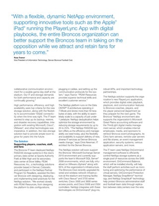 The Denver Broncos implemented NetApp FAS2240 storage systems to enhance their IT infrastructure, allowing them to manage data more efficiently while maintaining access for critical operations like game-day applications and team communications. This solution has streamlined storage management, reduced costs, and improved data recovery, enabling the team to support new initiatives such as mobile applications for fans. The Broncos IT team emphasized that this technology enhances their ability to operate effectively without downtime, ensuring they can continue delivering a competitive experience for both players and fans.