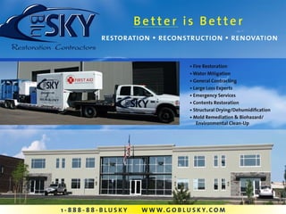 Blu SKY is a restoration company with offices in Colorado, Kansas, Georgia, and Florida. They provide water mitigation, fire restoration, mold remediation, and contents restoration services. Blu SKY aims to quickly respond to losses and uses certified technicians and the latest technologies and methods to fully restore properties in a cost-effective manner. They also offer roofing, consulting, and expert witness services related to restoration work.