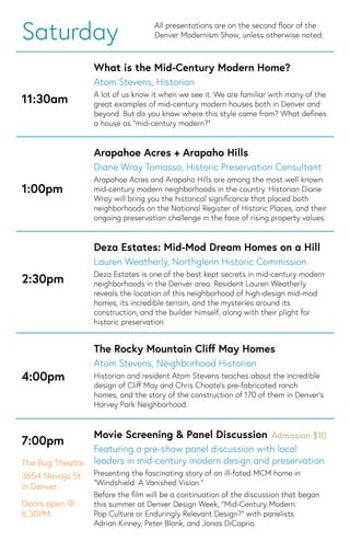 Denver Modernism Week is an annual celebration of mid-century modern architecture and design, focusing on the city's historic homes and neighborhoods from the 1950s and 60s. The event features various presentations, discussions, and screenings aimed at increasing awareness and appreciation of Denver's architectural heritage and the importance of preservation. The inaugural event took place from August 26-27, 2017, and future events are planned to continue promoting mid-century modern design in the area.
