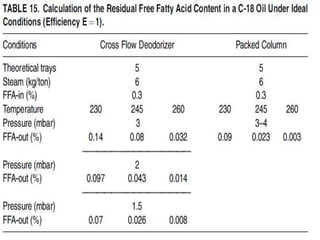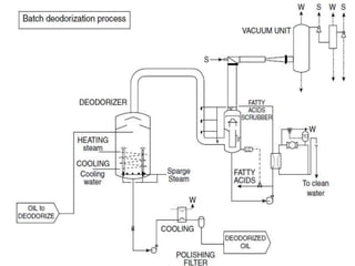 This document summarizes various deodorization techniques used in refining edible oils. It discusses the deodorization process, which involves de-aeration, heating the oil to high temperatures under reduced pressure, steam stripping of volatile compounds, and cooling. Different deodorizer systems are also summarized like batch, semi-continuous, and continuous deodorization systems. Newer technologies like dual temperature deodorization and dry ice condensation are also briefly described to improve efficiency.