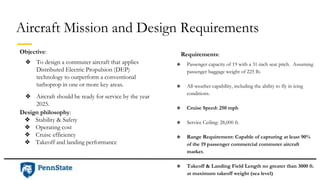NASA is developing a 19-passenger commuter aircraft that uses Distributed Electric Propulsion (DEP) technology to outperform conventional turboprop aircraft. The DEP aircraft is designed to have a range of 875 miles, cruise speed of 250 mph, and service ceiling of 28,000 feet. It will be powered by 10 electric motors and have a maximum takeoff weight of 16,860 pounds. NASA estimates it will cost $1.06 billion to develop the aircraft, but it could generate $292.6 million in profits if 310 are sold.