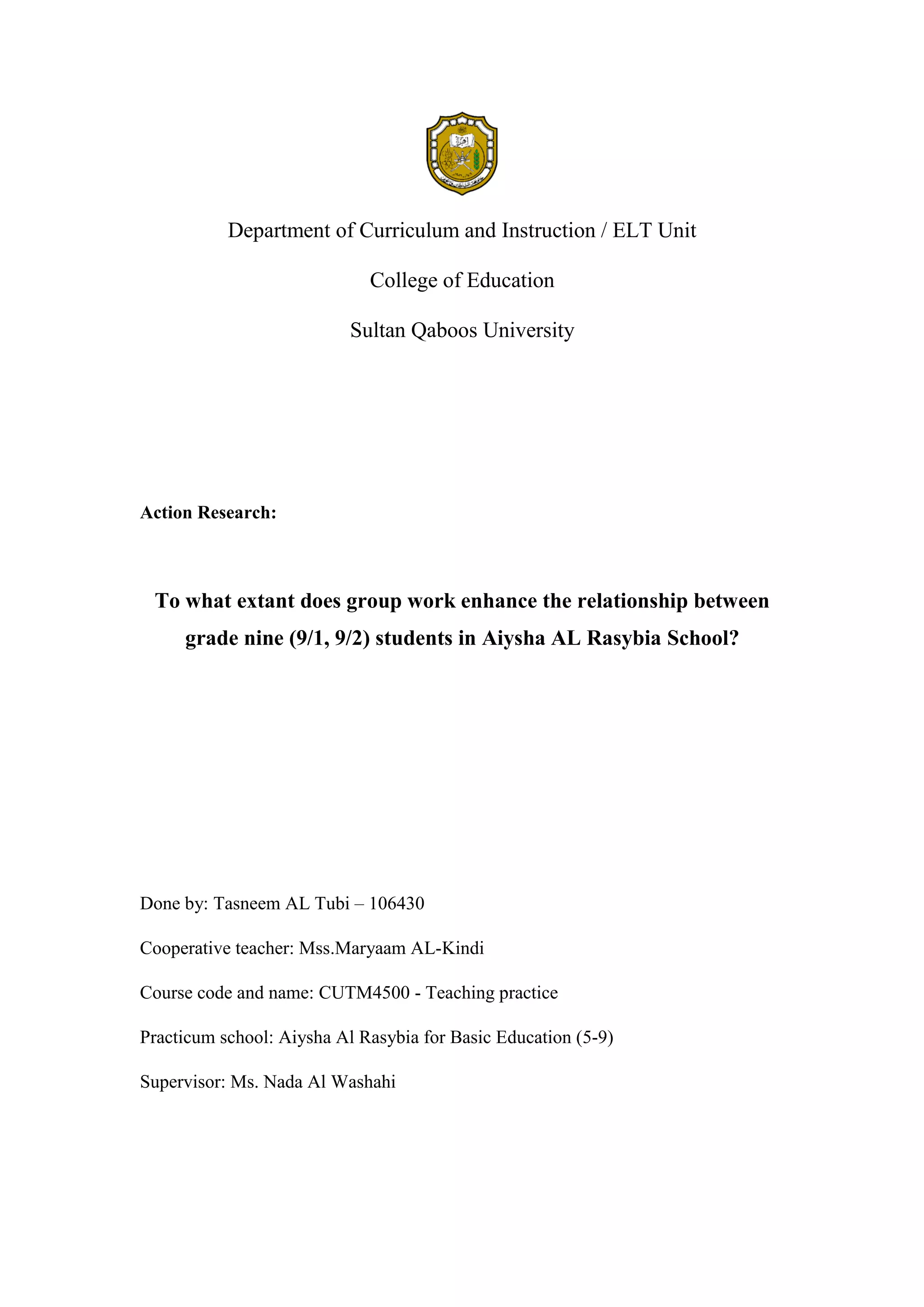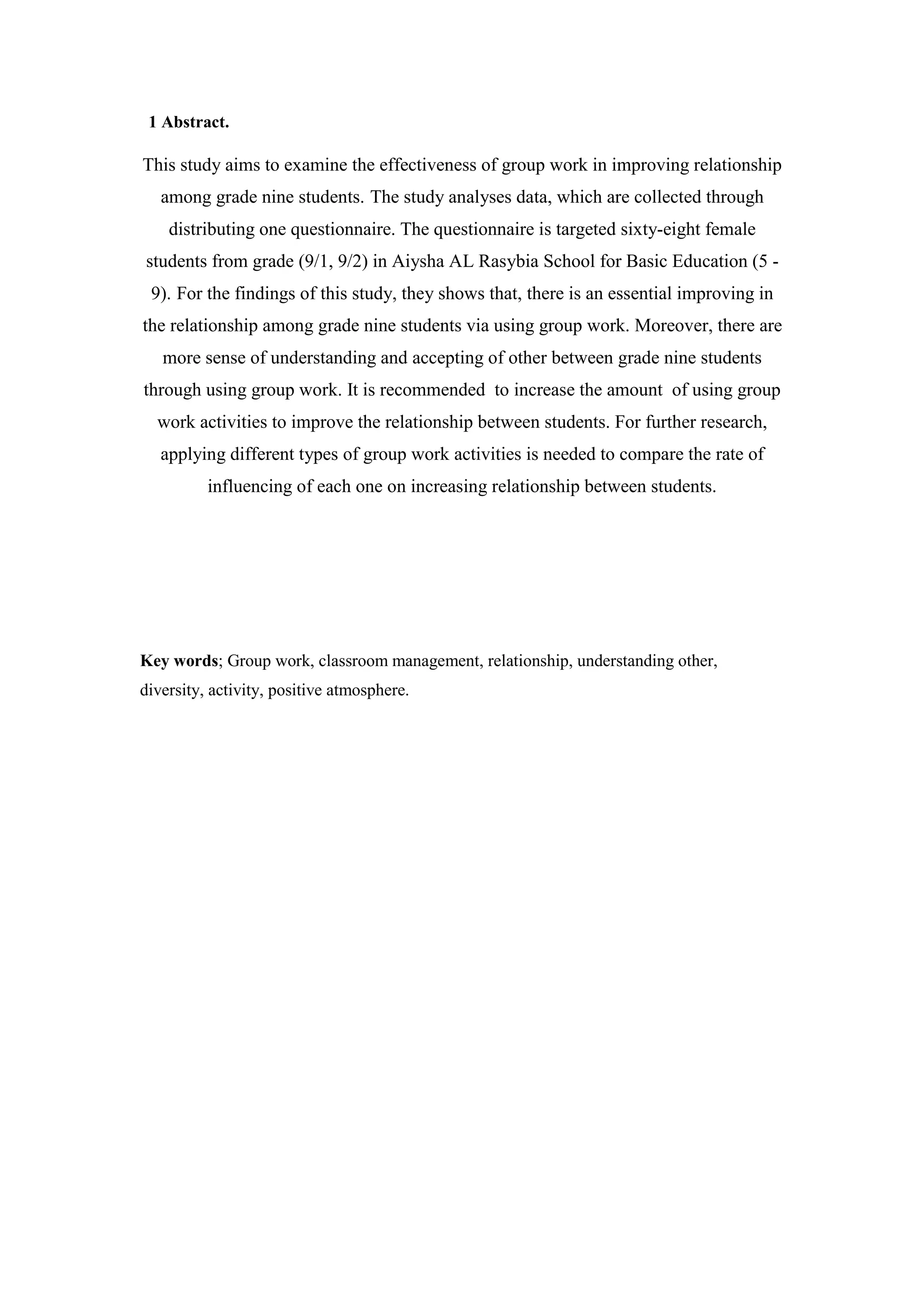 This study examines the effectiveness of group work in improving relationships among grade 9 students in Aiysha AL Rasybia School. A questionnaire was distributed to 68 female students from grades 9/1 and 9/2 to analyze how group work impacts understanding and acceptance between students. The findings showed group work led to an essential improvement in student relationships and a greater sense of understanding and accepting others. It is recommended to increase the use of group work activities to further improve student relationships. Additional research applying different types of group activities could compare their influence on building relationships.