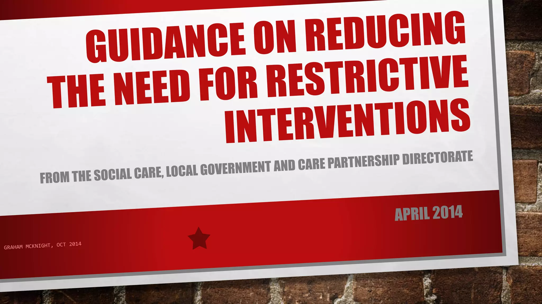The document discusses the framework of restrictive interventions in care settings, emphasizing the legal context of the Mental Capacity Act and the Deprivation of Liberty Safeguards. It highlights the necessity of reducing restrictive practices while ensuring the safety of vulnerable individuals, backed by new legislation aimed at enhancing the accountability of care providers. The guidance promotes a culture of using physical interventions only as a last resort and incorporates human rights principles into care practices.
