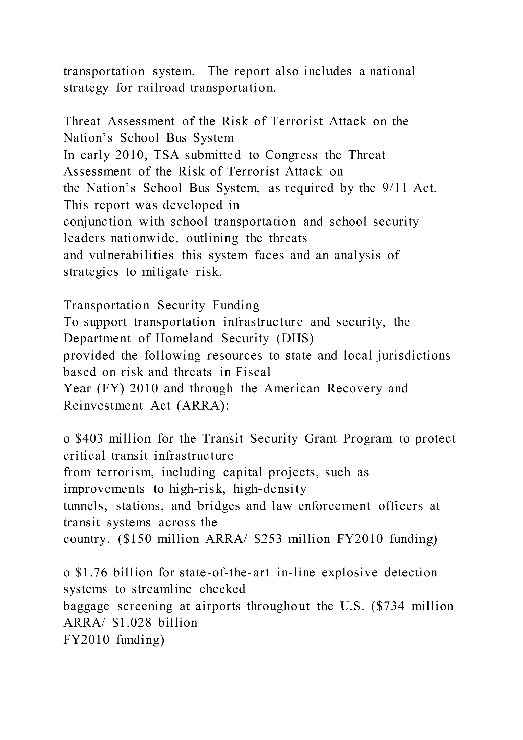 The Department of Homeland Security's July 2010 update outlines progress in implementing recommendations from the 9/11 Commission, including the completion of various security risk assessments for transportation systems. It details significant funding allocations aimed at enhancing security across transportation sectors, as well as the introduction of new screening measures for airline passengers and cargo. Additionally, the DHS emphasizes its collaboration with other government departments and international partners to strengthen aviation and maritime security against evolving terrorist threats.