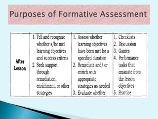 This document discusses classroom assessment and grading procedures. It defines formative and summative assessment, with formative used to guide instruction and summative to evaluate learning. Summative assessment has three components: written work, performance tasks, and quarterly exams. A standards-based grading system is used, with 60 as the minimum passing grade. Scores from each component are calculated as percentages based on highest possible scores, then weighted according to the subject to determine final grades.