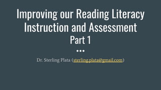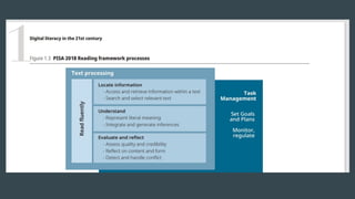 This document discusses improving reading literacy instruction and assessment. It begins with an introduction and learning outcomes. It then discusses changes in the nature of reading literacy due to evolving technologies. Next, it defines reading literacy according to PISA and discusses its framework, including proficiency levels from 1b to 3. It provides sample test items for different levels. It also discusses evidence-based practices for struggling adolescent readers, including emphasizing effort and growth mindset. Finally, it discusses improving reading motivation through SDGs and varying text types and formats.