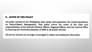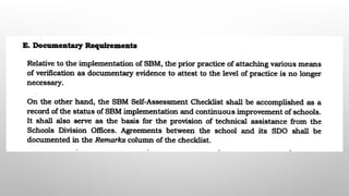 The document is a checklist for the School-Based Management (SBM) system prepared by Charlie I. Ureta, an education program supervisor at SGOD. It emphasizes the importance of the SBM system in education management. The document concludes with a note of gratitude.