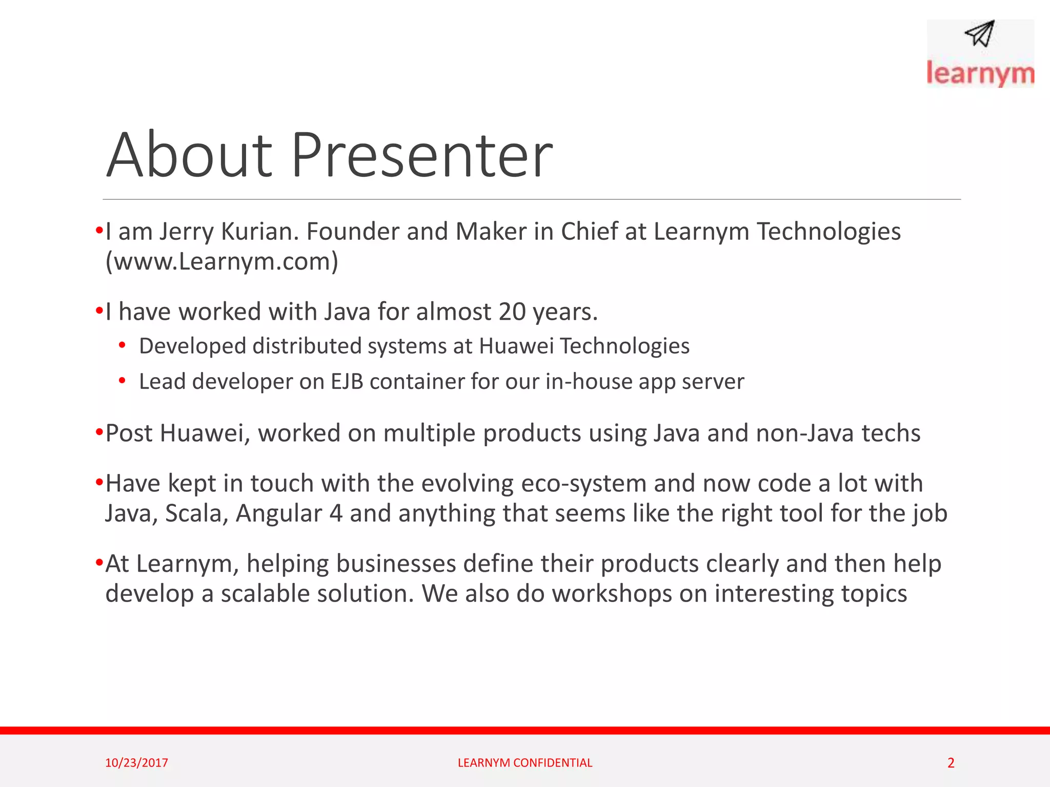 The document discusses the importance of dependency injection in achieving a scalable modular architecture using Java, led by Jerry Kurian from Learnym Technologies. It explains how Java annotations can simplify code by managing dependencies at runtime, allowing for components to work independently while still functioning effectively. The document details the process by which the Spring framework handles dependency injection, ensuring that relevant instances are created and injected appropriately.