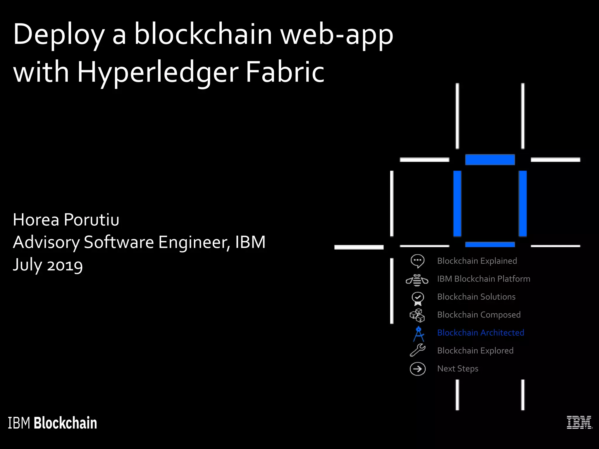 The document discusses deploying a blockchain web application using Hyperledger Fabric. It begins by introducing key concepts like blockchain vocabulary, the difference between public and private blockchains, and the architecture of a Hyperledger Fabric solution. It then covers the components of a Hyperledger Fabric network, including peers, smart contracts, the ledger, and client applications. It provides an example of how a smart contract updates the world state and an example use case of an e-voting application on the blockchain.