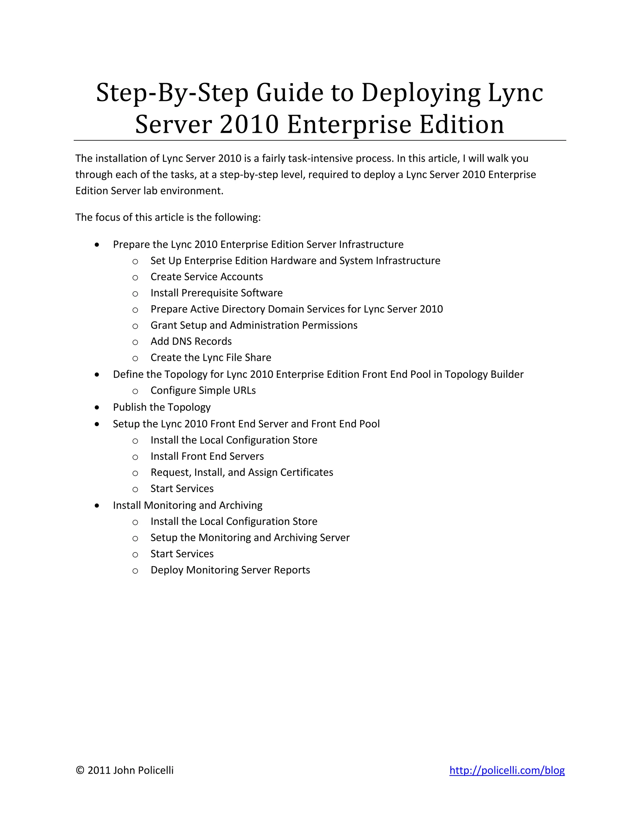 The document provides step-by-step instructions for deploying Lync Server 2010 Enterprise Edition, including:
