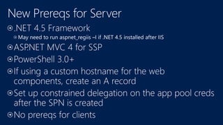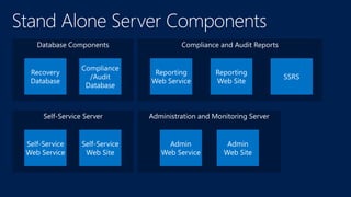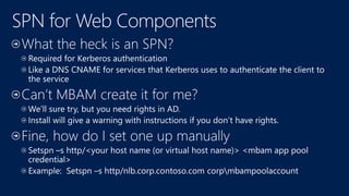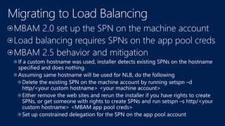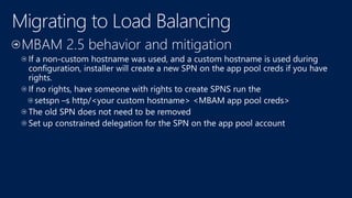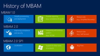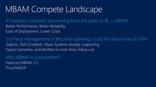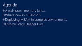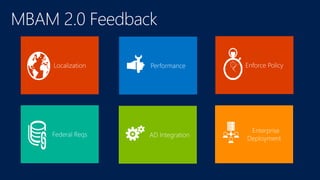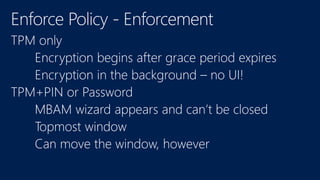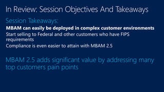 The document discusses new features and improvements in MBAM 2.5, including improved compliance and encryption enforcement through added grace periods, support for complex PINs and FIPS 140-2 standards. It also covers enhanced performance, localization support for 11 languages, improved Active Directory integration, and support for enterprise scenarios through features like load balancing and high availability configurations.