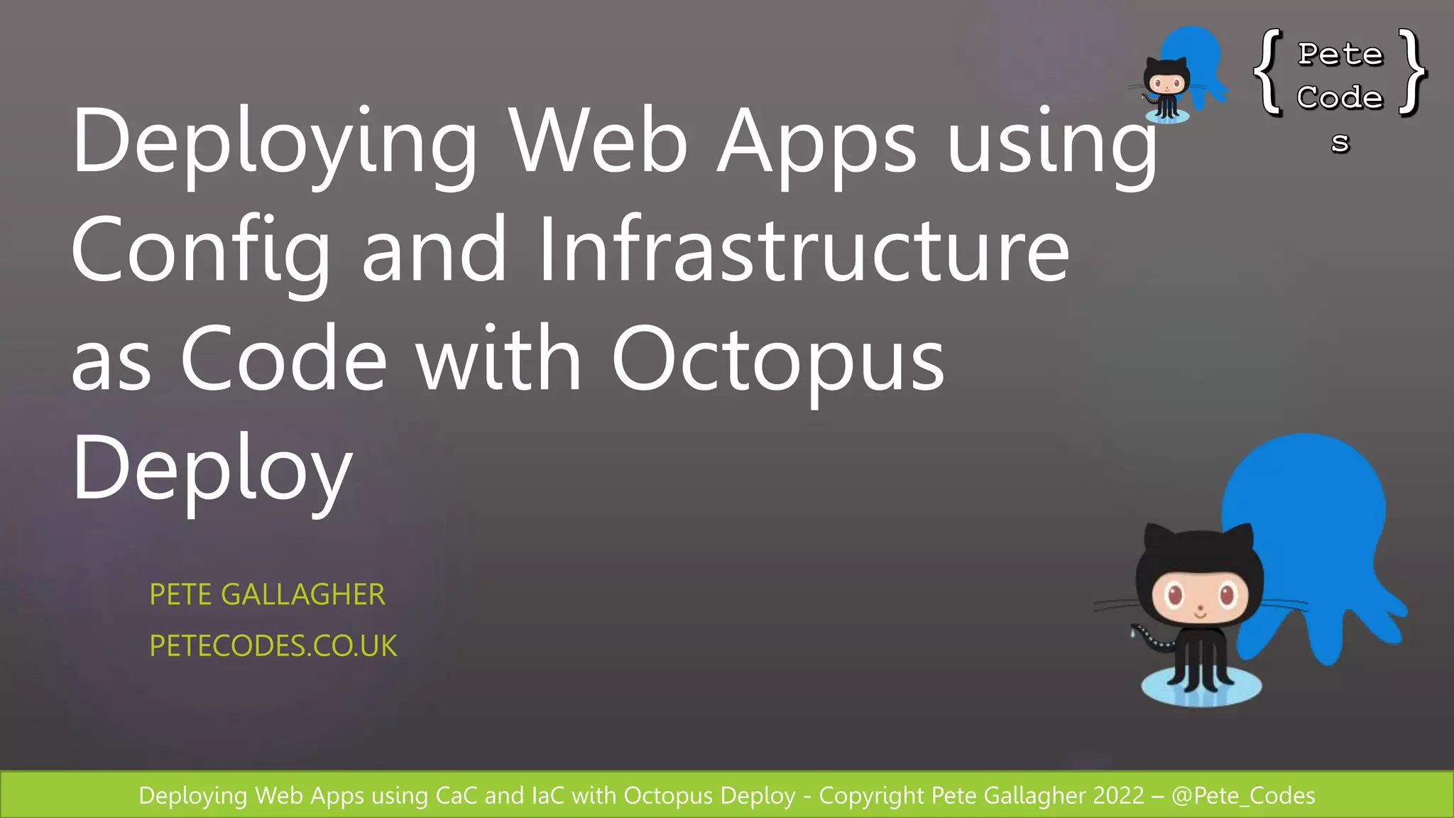 The document discusses deploying web apps using configuration as code (CaC) and infrastructure as code (IaC) with Octopus Deploy. Octopus Deploy allows automating deployments through releases and runbooks that can be defined as code. The document demonstrates configuring Octopus Deploy with CaC stored in a repo to define the deployment process, variables, and runbooks. It also shows using Octopus Deploy with GitHub Actions to install the Octopus CLI, push packages, create releases, and run runbooks through a CI/CD pipeline.