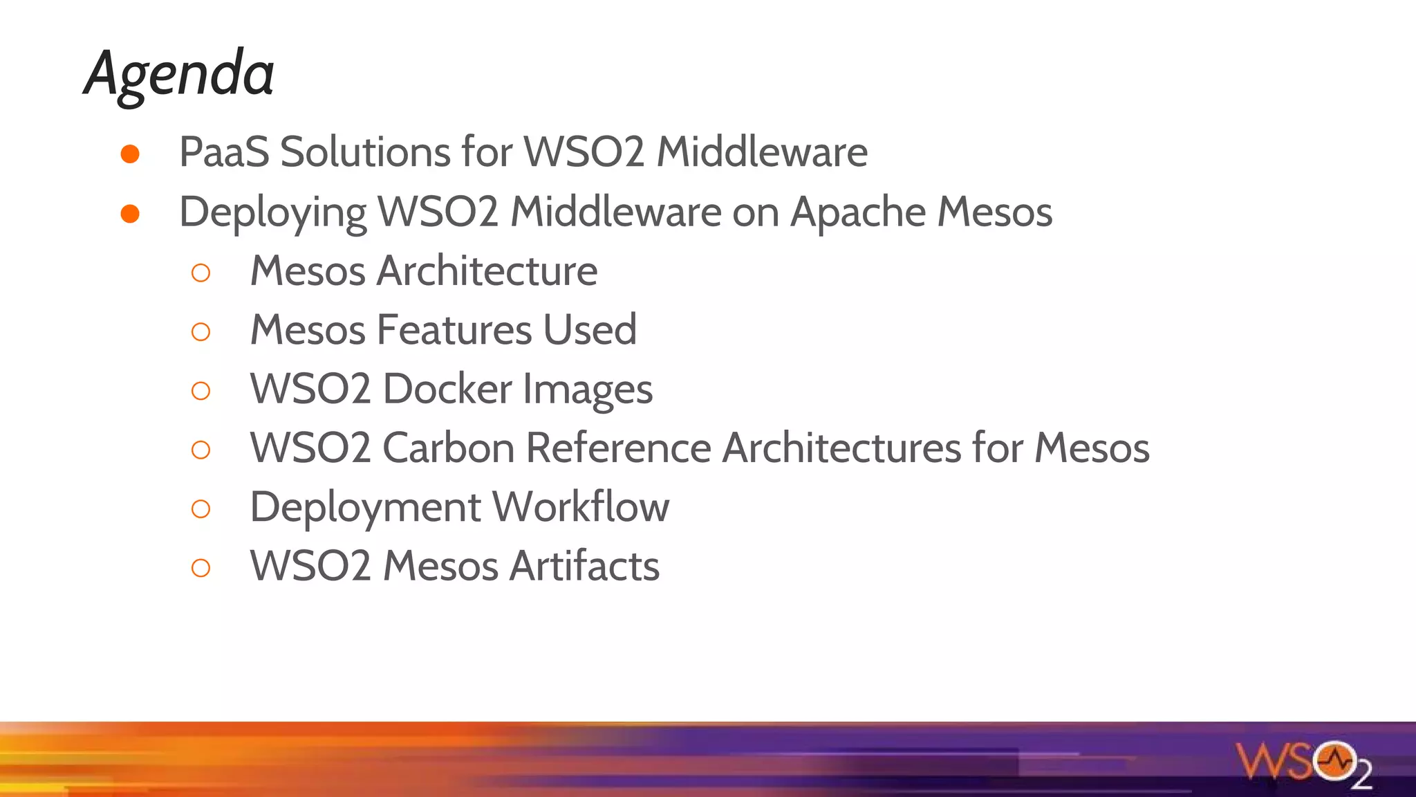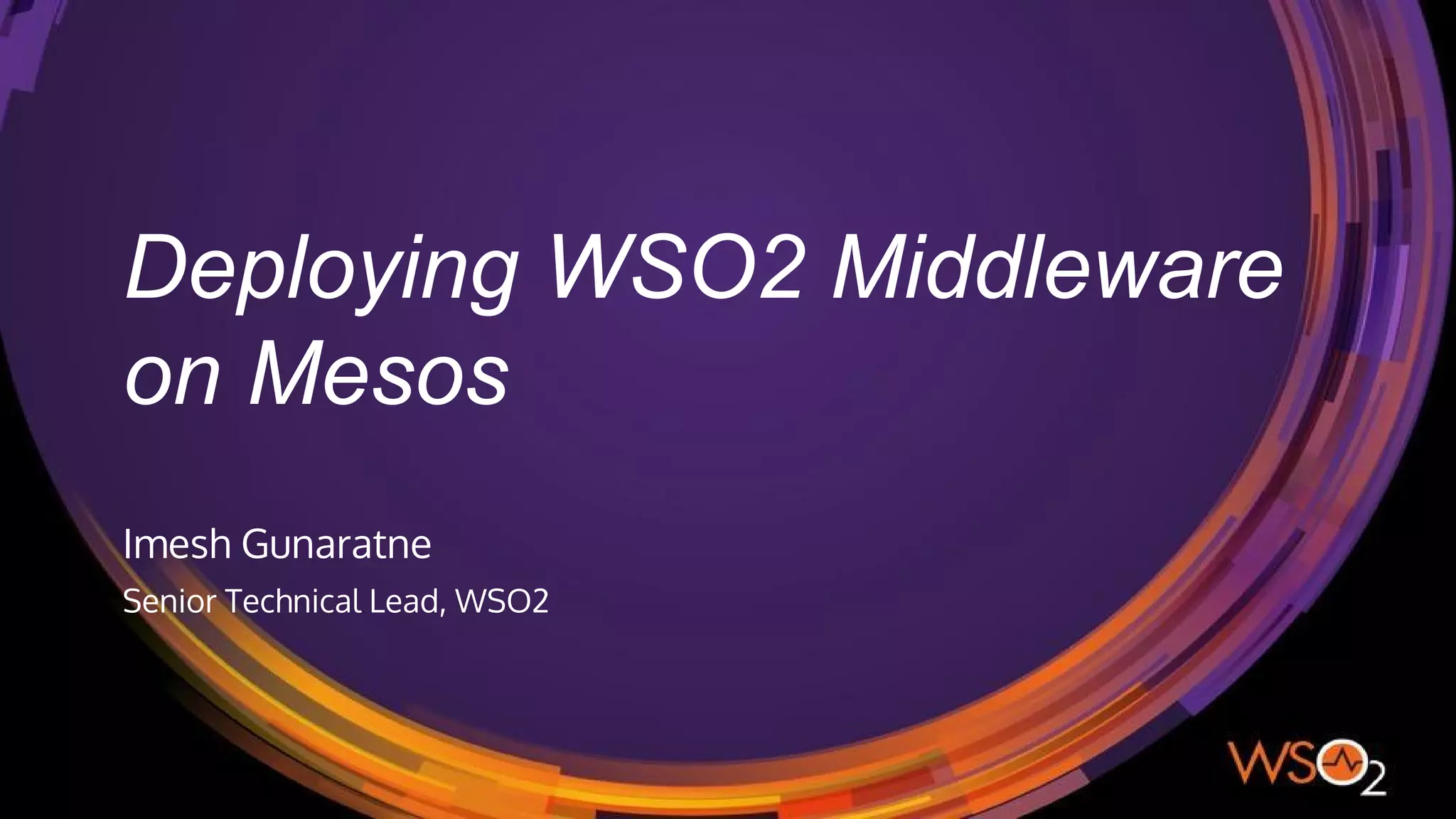 This document summarizes deploying WSO2 middleware on Apache Mesos. It discusses using Mesos and Docker to deploy WSO2 products as containers in a clustered and scalable way. Key points include: Mesos architecture and features for scheduling resources and containers; using WSO2 Docker images with Mesos; a reference Carbon architecture on Mesos using Marathon load balancers; and the deployment workflow of building Docker images, importing them to a registry, and deploying Mesos artifacts.