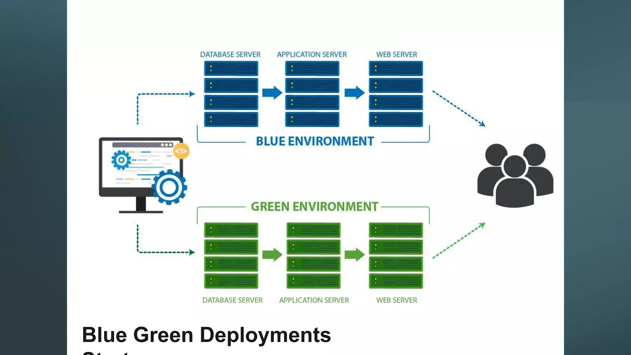 Blue green deployments involve creating two identical production environments called blue and green. Only one environment receives live traffic at a time, while the other remains idle. When an application update is ready, it is deployed to the idle environment. Once testing is complete, traffic is routed to the updated environment, which becomes the new production environment while the other goes idle. This process eliminates downtime and allows easy rollbacks if needed.