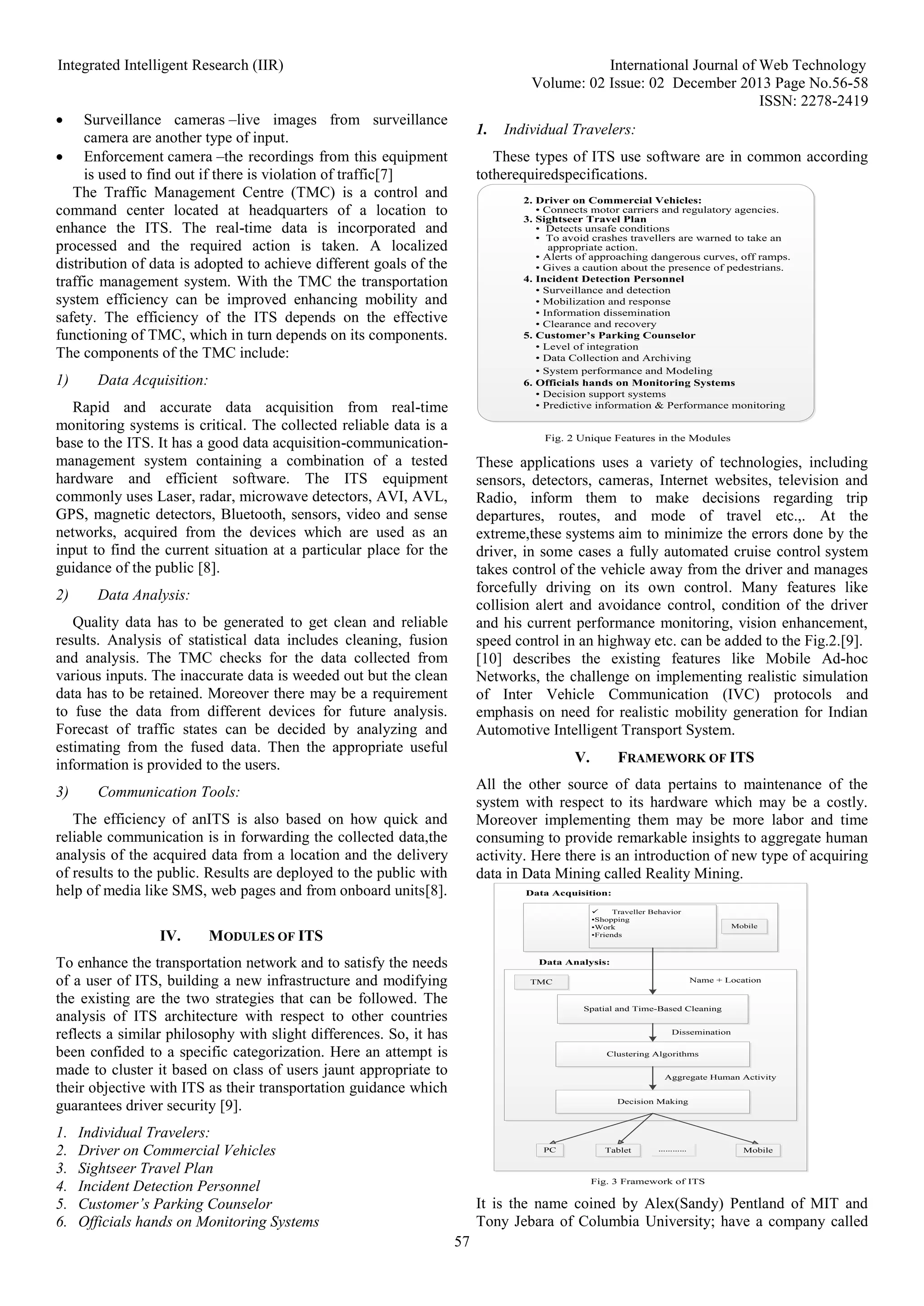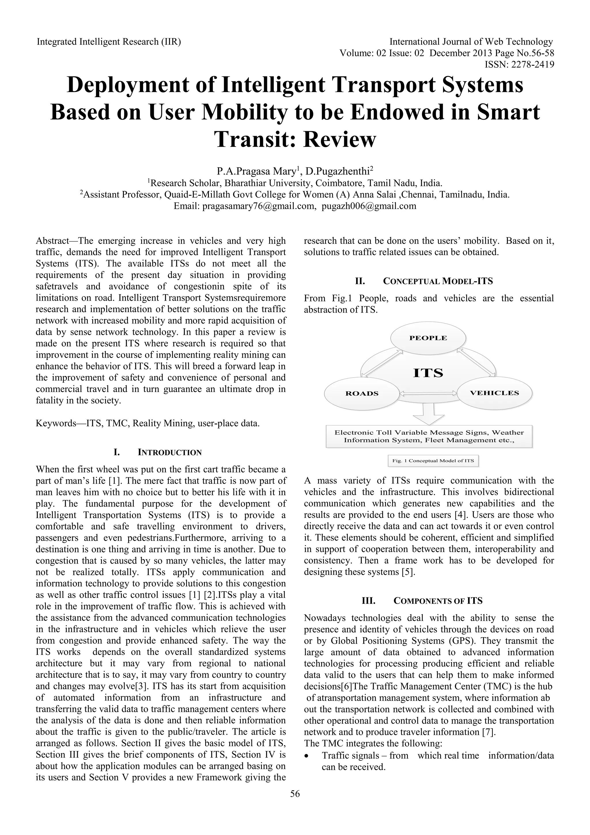 The document provides a review of intelligent transport systems (ITS) focusing on user mobility and the implementation of advanced technology to improve travel safety and efficiency. It discusses the components, architecture, and challenges of ITS, emphasizing the need for effective data acquisition and analysis through reality mining to enhance decision-making in transportation. The framework proposed aims to utilize existing data effectively while adapting to the complexities of modern transport systems.