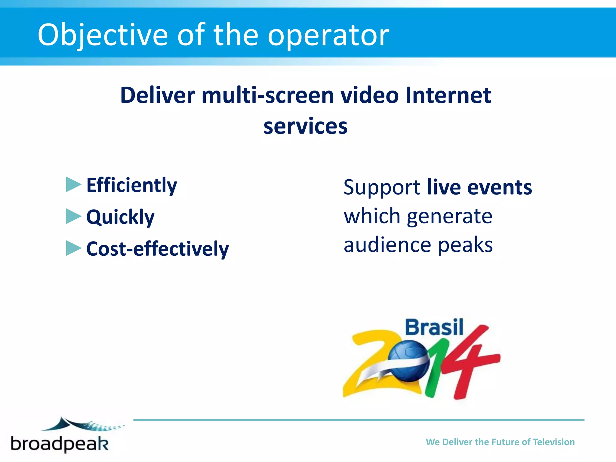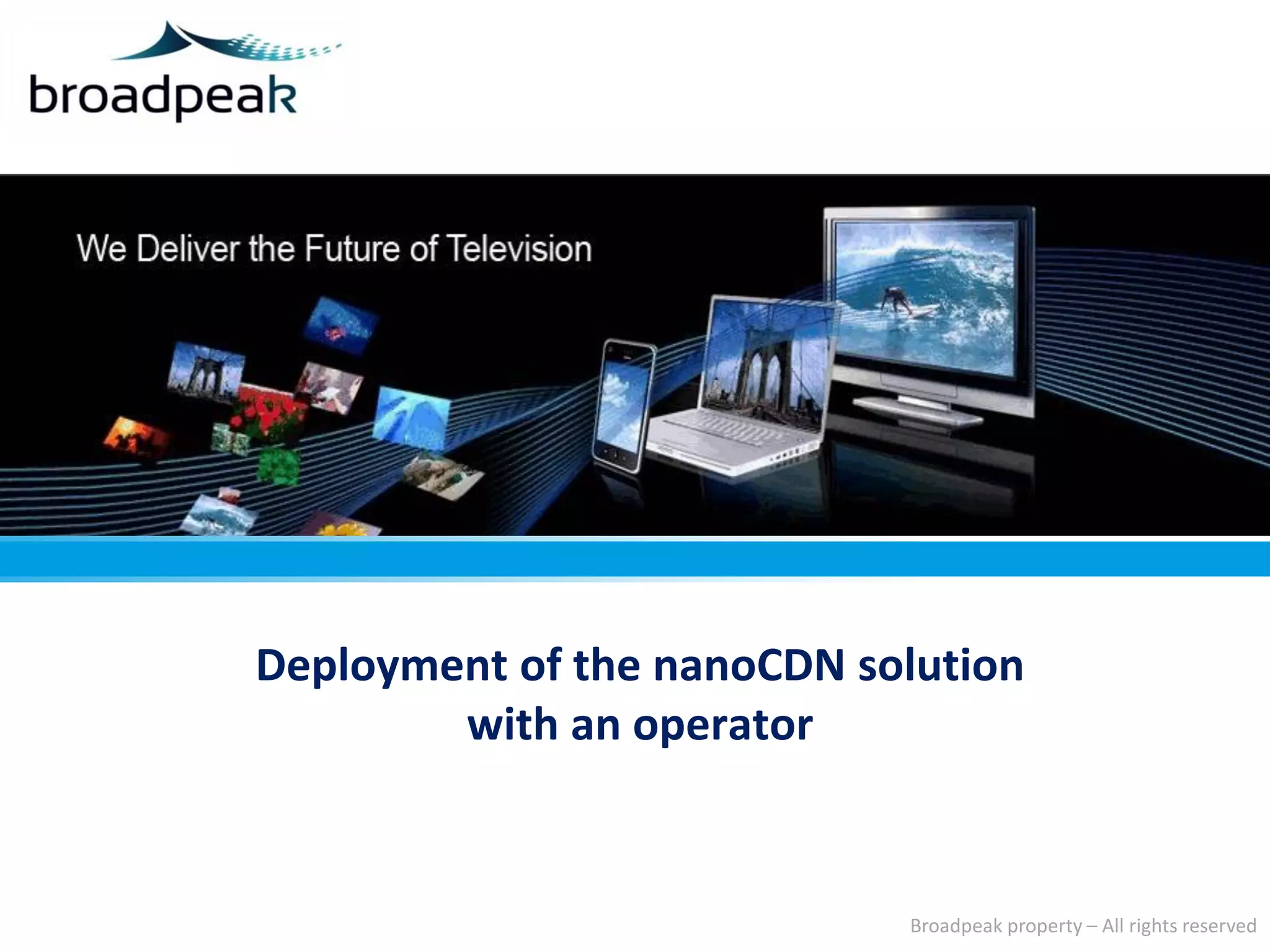 The document outlines the deployment of Broadpeak's Nanocdn solution for multi-screen video internet services, emphasizing efficiency, scalability, and user experience during high-demand live events. It highlights how Nanocdn transforms multicast streams into unicast to conserve bandwidth while delivering high-quality content across devices, all while ensuring compliance with streaming standards. Additionally, the solution promises cost-effectiveness and continuity of service, without the need for additional proprietary equipment or software.
