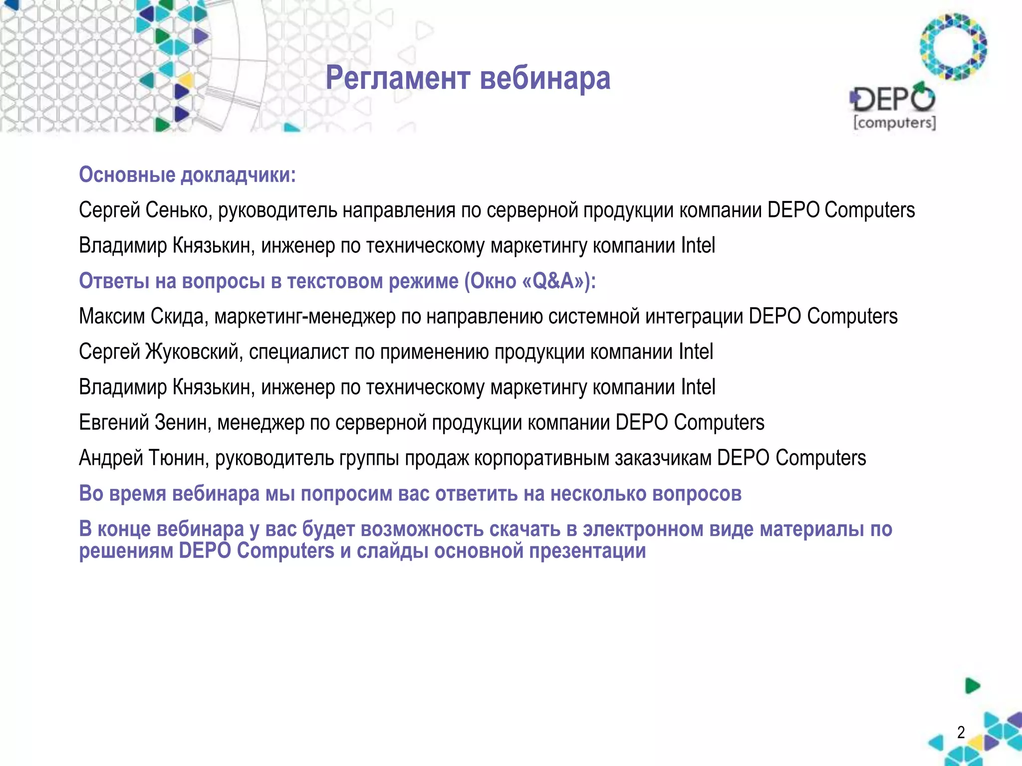 Документ описывает вебинар, посвященный современным решениям для центров обработки данных (ЦОД) от компании Depo Computers и Intel, где основное внимание уделяется тенденциям, требованиям и современным серверным решениям. Участники вебинара смогут задать вопросы и получить доступ к материалам, включая обсуждение технологий, продуктовых решений и программного обеспечения для управления ЦОД. Вебинар рассматривает возможности модернизации и стратегического управления инфраструктурой ЦОД, а также достижения компании Depo Computers на рынке.