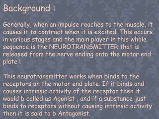 This document discusses depolarizing neuromuscular blockers, which are drugs that cause muscle relaxation by initially stimulating muscle fiber membranes through nicotinic acetylcholine receptors, leading to depolarization and muscle contraction, followed by desensitization of the receptors preventing further contraction. Succinylcholine is a commonly used depolarizing blocker that acts rapidly but has a short duration. It causes initial muscle fasciculations before paralysis sets in, reversing from smaller muscles to larger ones like the diaphragm. Depolarizing blockers are used to facilitate procedures like intubation but can rarely cause adverse effects like hyperkalemia or malignant hyperthermia.