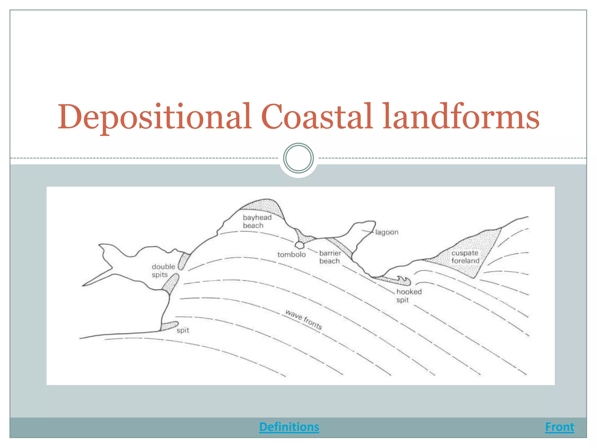 Depositional coastal landforms include spits, barrier beaches, and hooked spits. Spits are narrow landforms formed by longshore drift that extend into the sea at the mouth of a bay. Examples are Spurn Head in Yorkshire and Orford Ness in Suffolk. Barrier beaches are wide sandy landforms that stretch between coastal embayments and enclose lagoons, such as Slapton Sands in Cornwall. Hooked spits have recurved ends that form protective embayments due to changing wave patterns over time, seen at Hurst Castle Spit in the Solent.