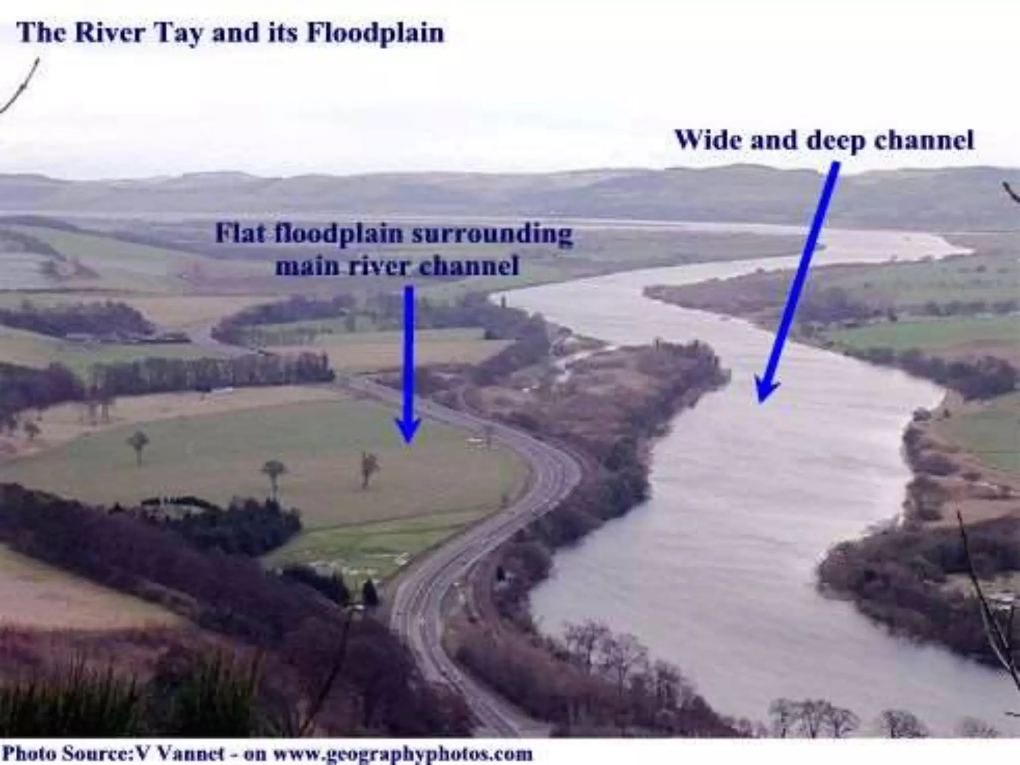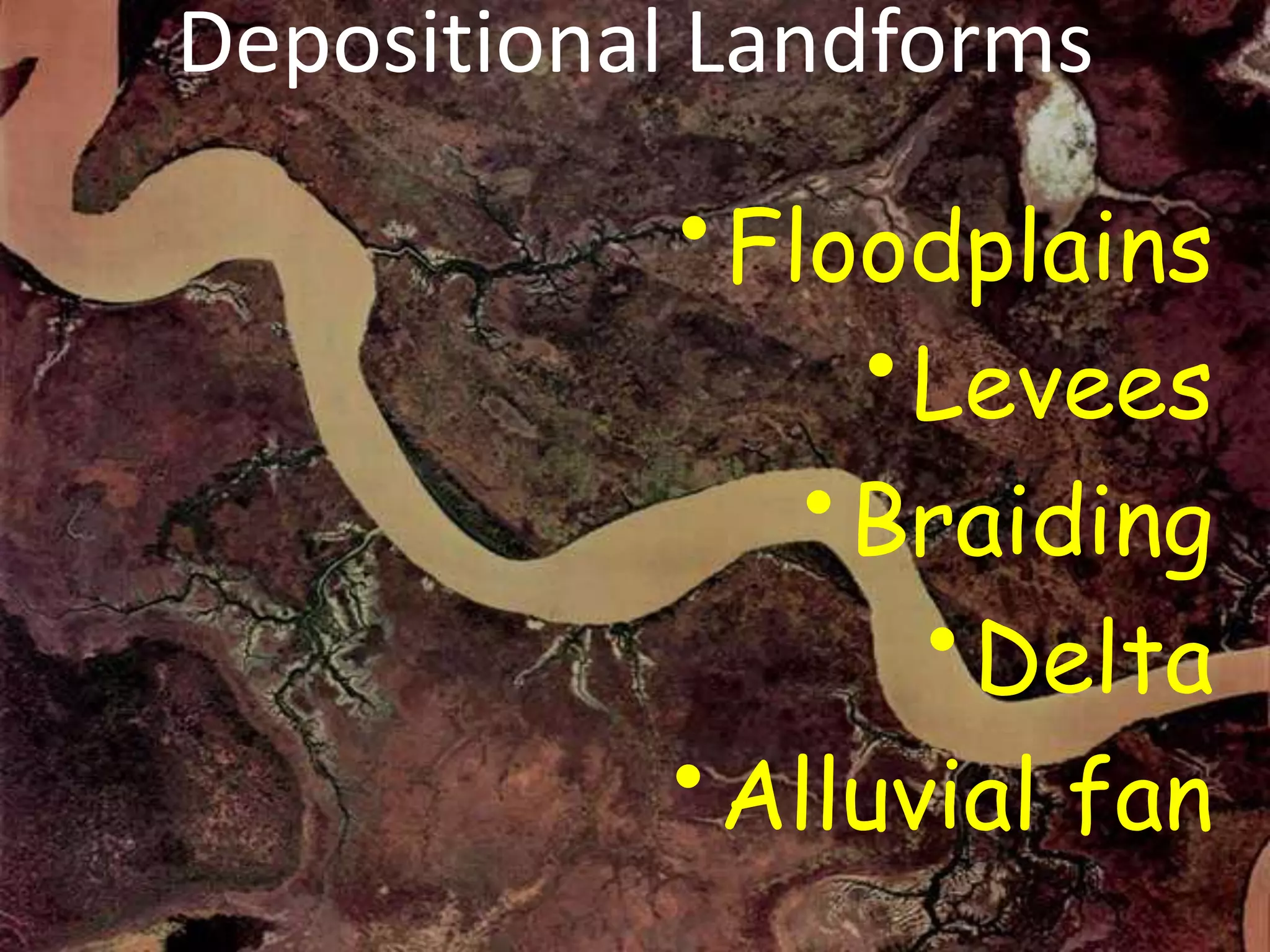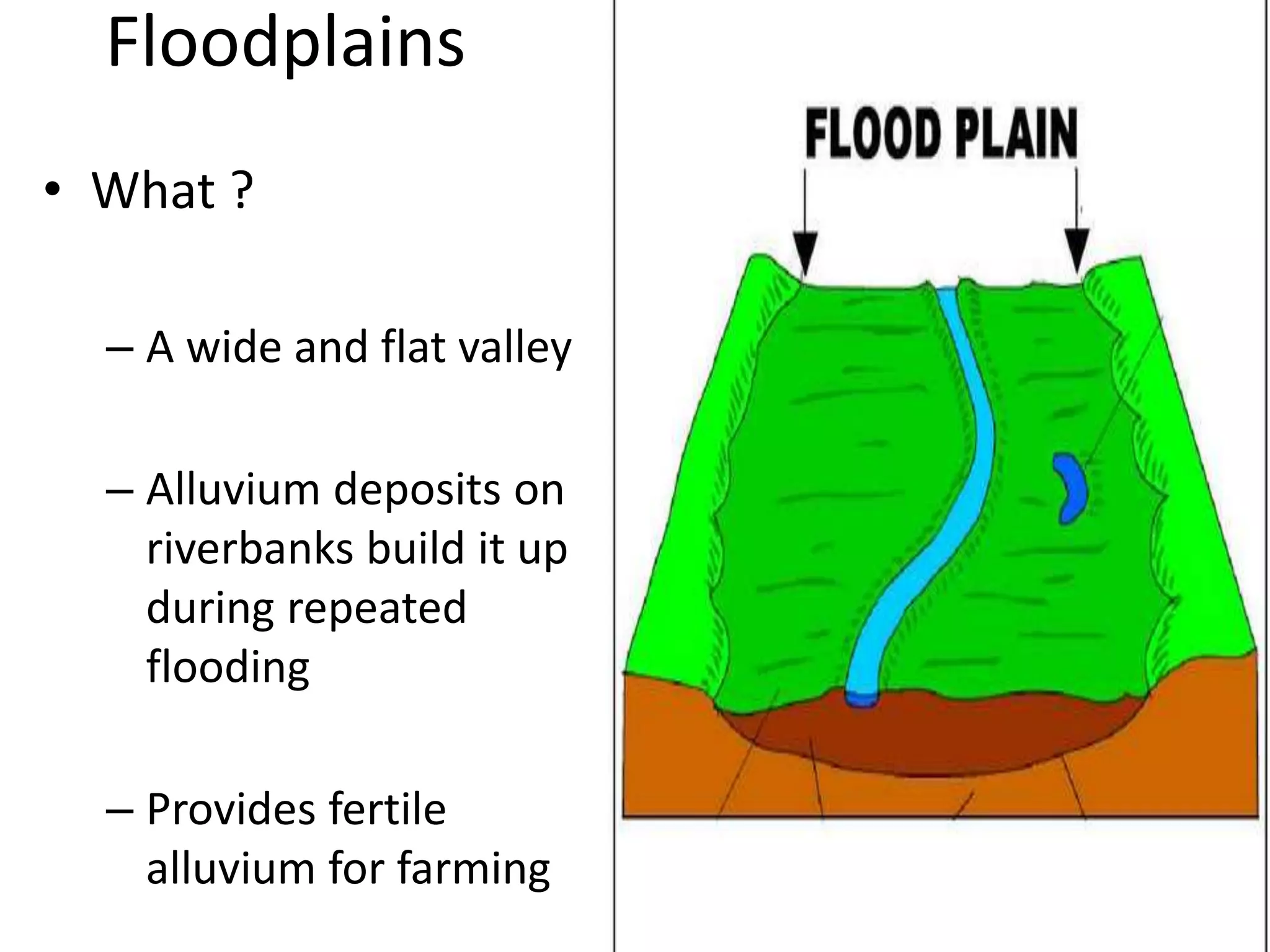 Floodplains form along river banks when flooding deposits sediment. Levees are natural embankments of coarser sediment deposited along river banks during floods. Braided rivers divide into small streams separated by islands of deposited gravel and sand within the channel. Deltas are flat lands formed of sediments deposited at river mouths, with distributaries transporting sediment into the sea.