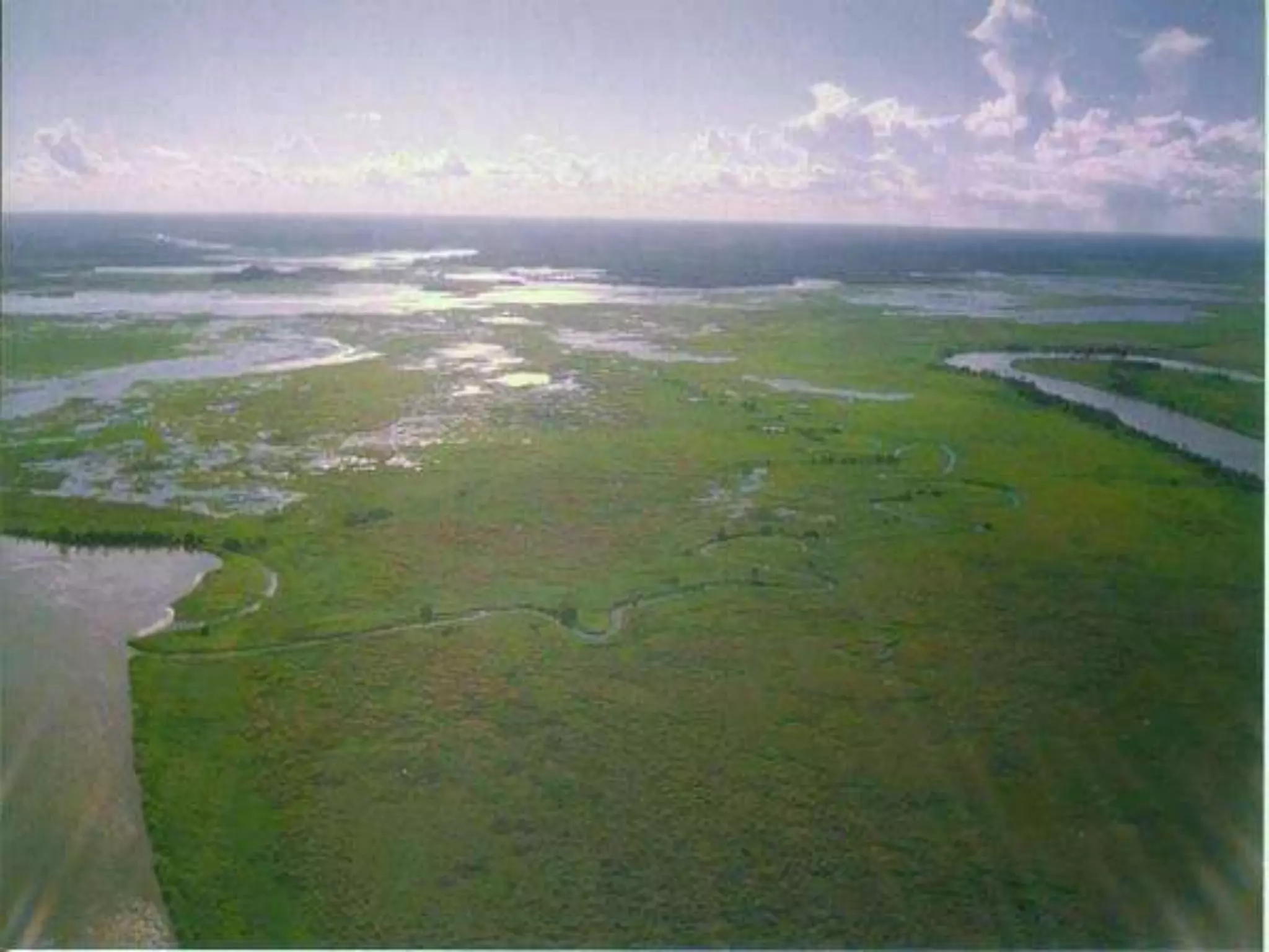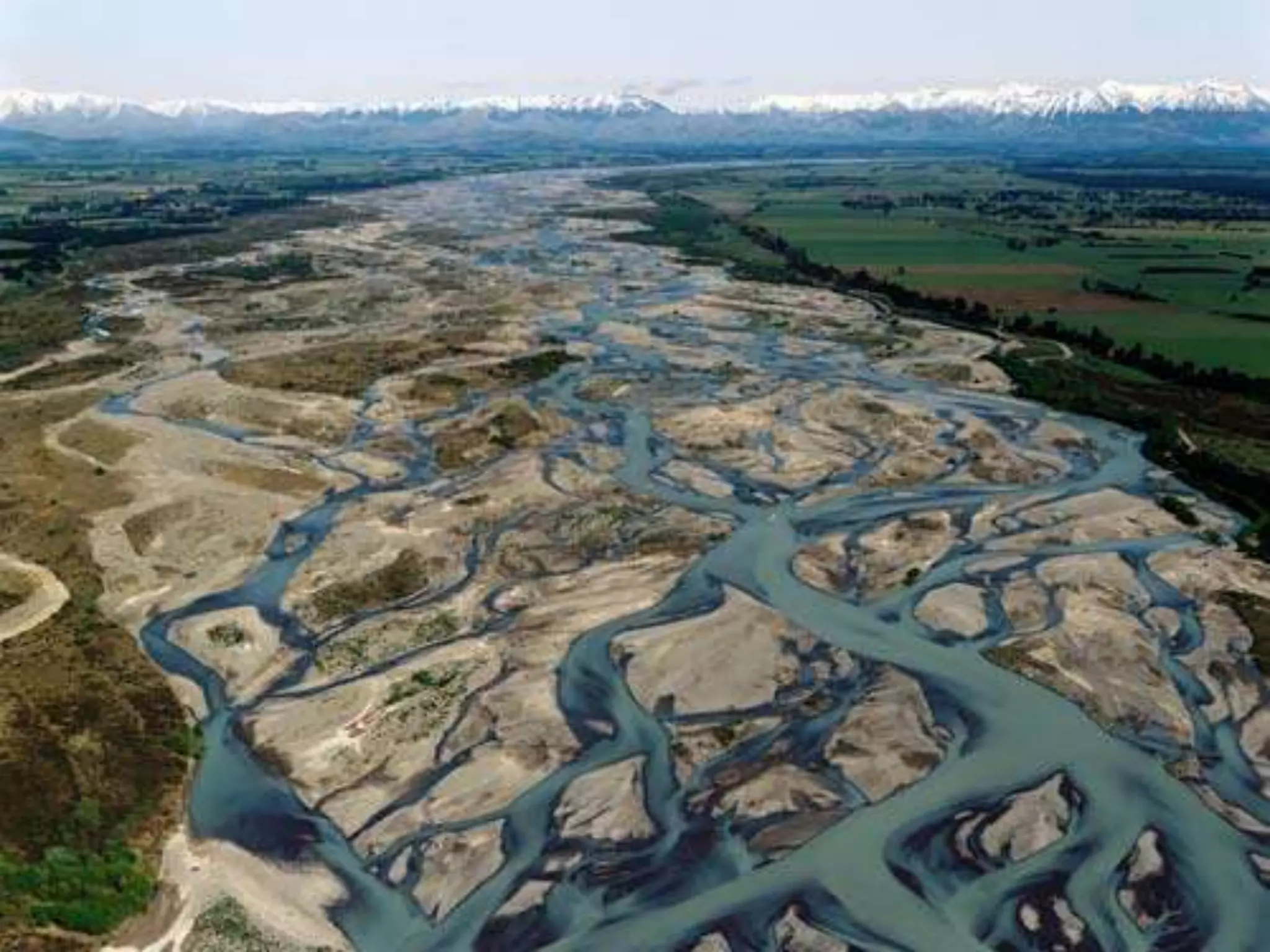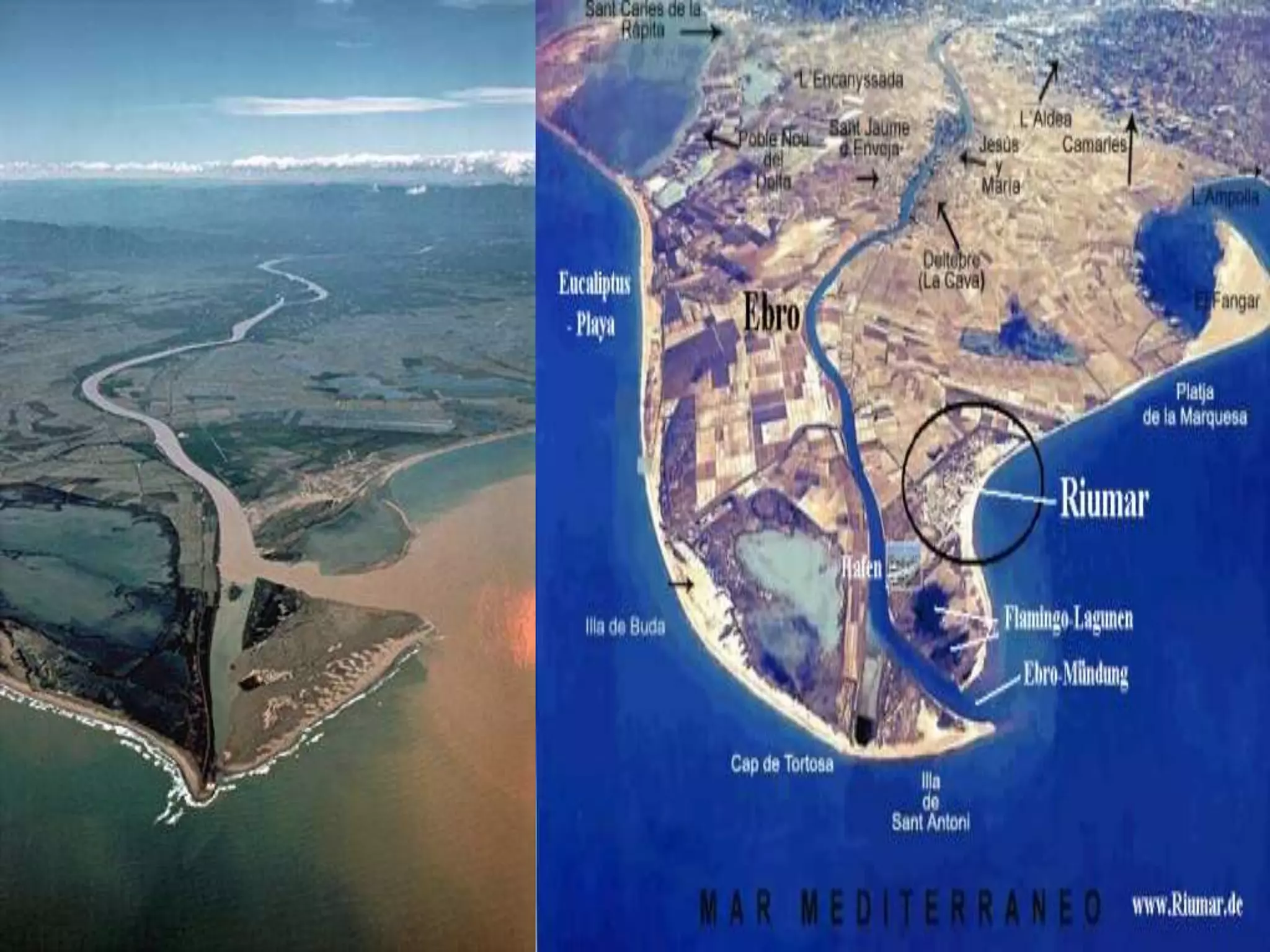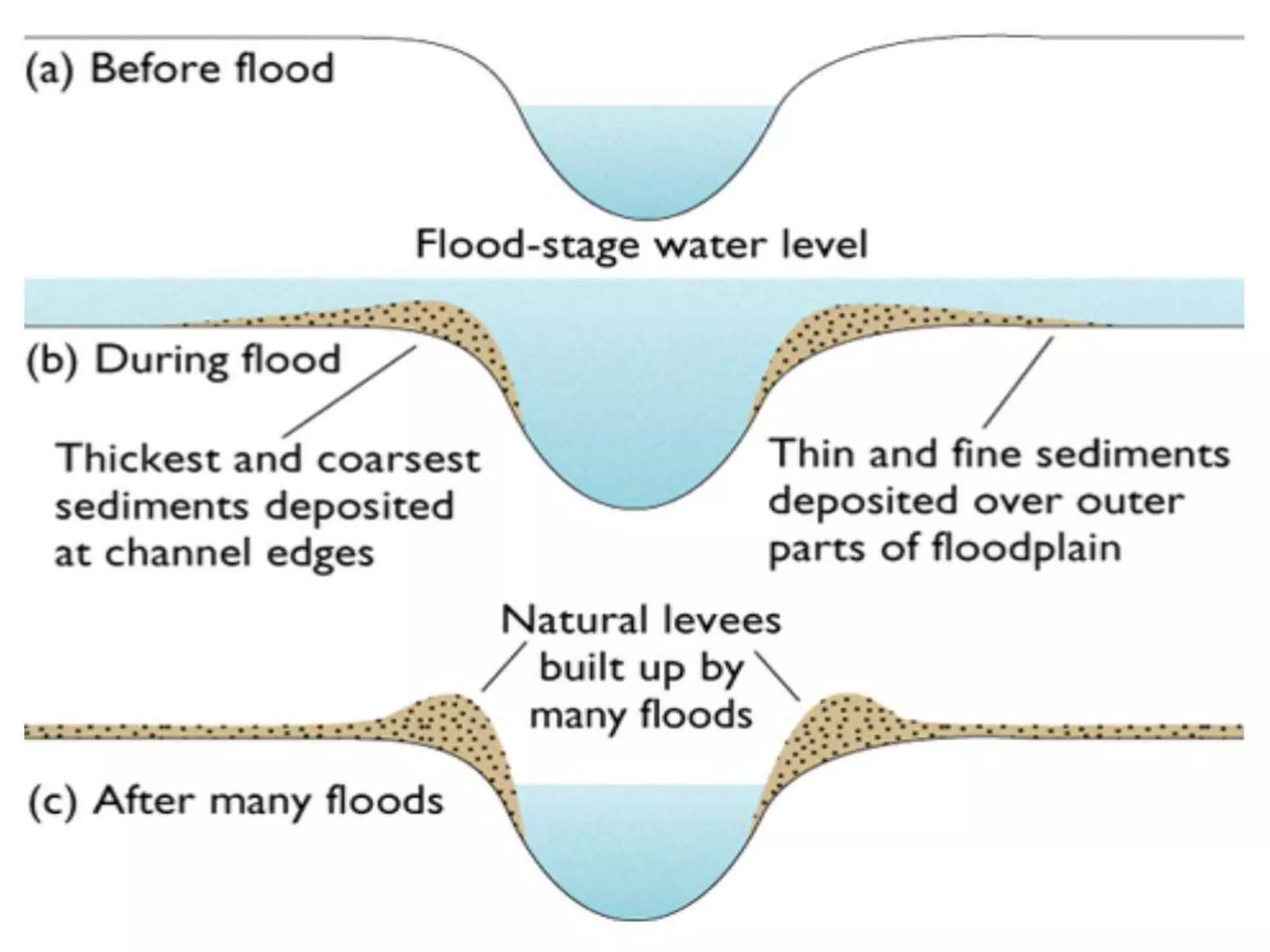 Floodplains form along river banks when flooding deposits sediment. Levees are natural embankments of coarser sediment deposited along river banks during floods. Braided rivers divide into small streams separated by islands of deposited gravel and sand within the channel. Deltas are flat lands formed of sediments deposited at river mouths, with distributaries transporting sediment into the sea.