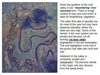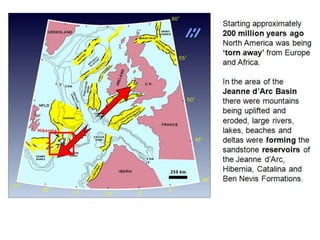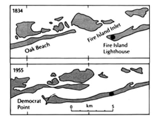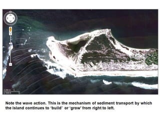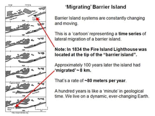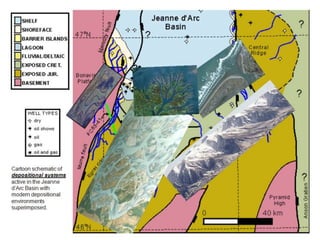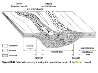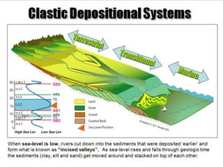 The document discusses the processes involved in the deposition and formation of reservoir rocks, illustrating how erosion, sediment movement, and stratification occur in various environments, including clastic shorelines and river deltas. It emphasizes the importance of understanding ancient depositional environments in locating oil and gas reserves, linking modern geological features to their older counterparts. Additionally, it highlights the role of organic matter and sedimentary layering in the creation of viable sources for fossil fuels.