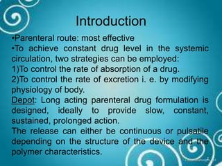 This document presents information on parenteral depot systems for long acting drug formulations. It discusses various approaches for controlled drug release including the use of viscous vehicles, polymeric microspheres, and drug derivatives. Common polymers used in depots are described as well as desirable characteristics. The main types of depot formulations are discussed - dissolution controlled, adsorption, encapsulation, and esterification. Examples of specific long acting preparations are provided for antibiotics, insulin, vitamin B12, and contraceptives. Evaluation methods and the development of depots are outlined.