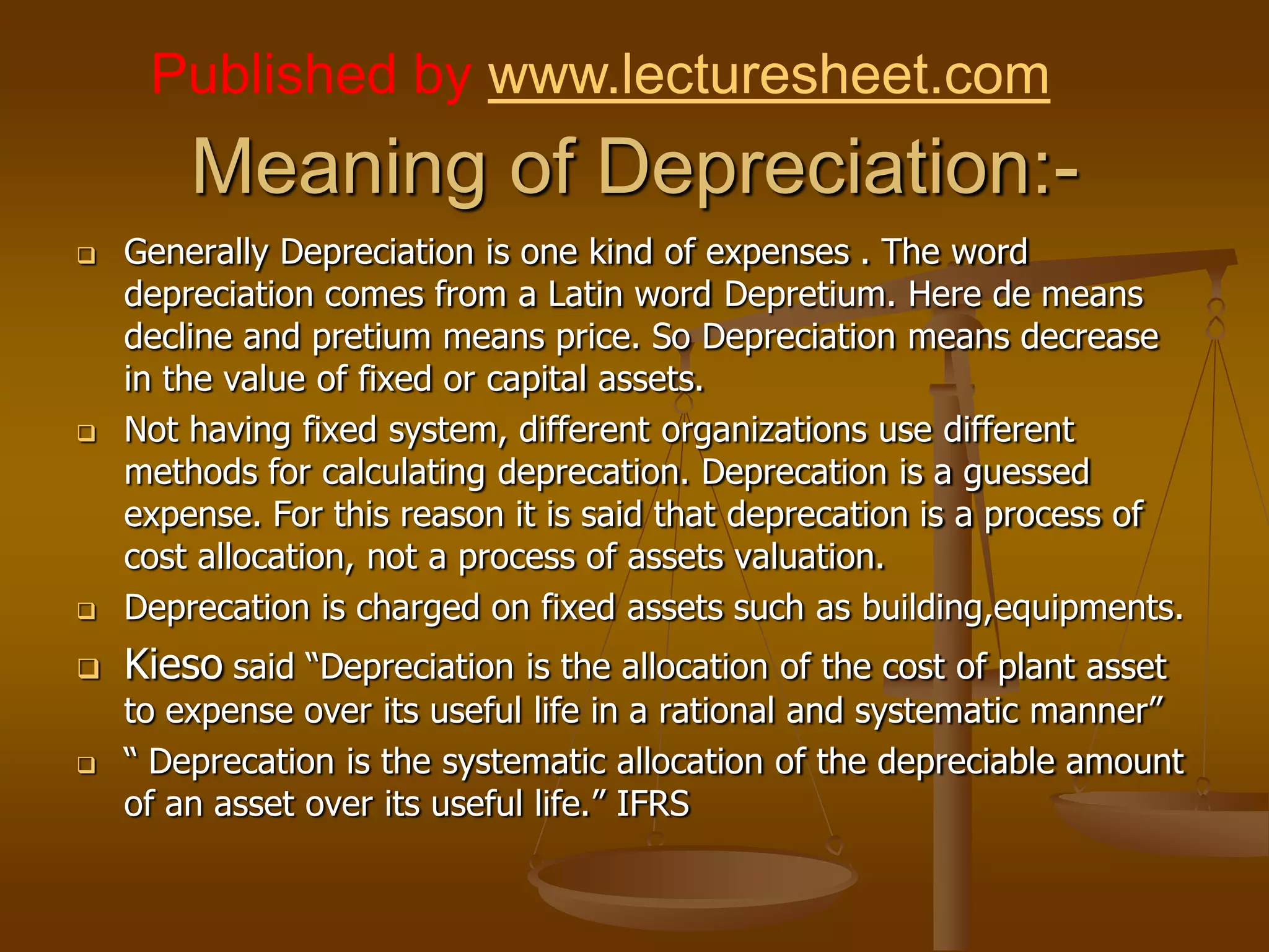 The document discusses depreciation, which refers to the decrease in value of fixed assets over time. Depreciation is a method of allocating the cost of fixed assets over their useful lifetime in a systematic manner. It is an expense that is charged against profits each year to reflect the use and aging of fixed assets. Calculating depreciation helps determine actual profit/loss, cost of production, asset value over time, and ensures capital is maintained. Various methods can be used to calculate depreciation based on original cost, additions, estimated useful life, and residual value of the asset.