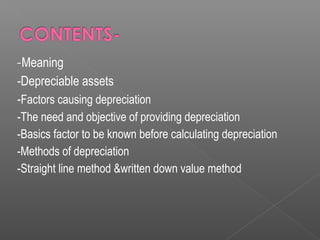 This document discusses depreciation of fixed assets. It defines depreciation as a permanent decline in the value of fixed assets over time due to factors like wear and tear, age, and obsolescence. It explains that depreciation is calculated to allocate the cost of a fixed asset over its useful life. The key methods of depreciation discussed are the straight-line method, where depreciation is equal each period, and the reducing balance method, where depreciation decreases each period as the asset's value declines.
