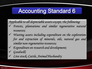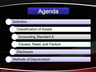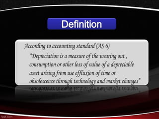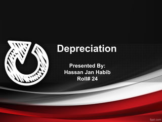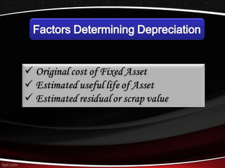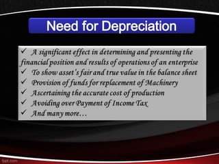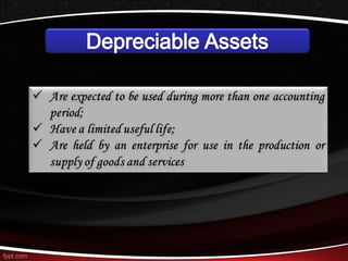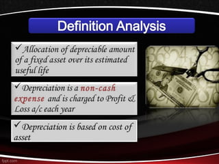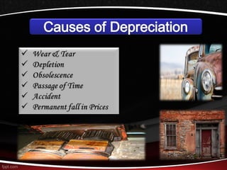 This document discusses different methods for calculating depreciation of tangible and intangible assets. It provides examples of straight-line depreciation, units of production depreciation, and declining balance depreciation methods. It also mentions that most corporations use the Modified Accelerated Cost Recovery System (MACRS) for tax depreciation purposes, which allows for rapid write-off of assets to stimulate new investment.