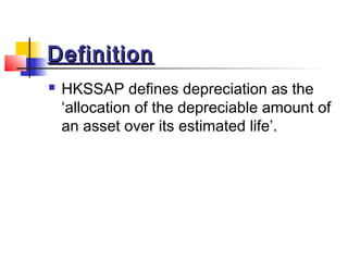 The document provides a comprehensive overview of depreciation as defined by HKSSAP, detailing its objectives and various methods including straight line, reducing balance, revaluation, sum of digits, and production output methods. It explains the classification of assets into depreciable and non-depreciable, lists depreciation calculations, and outlines accounting treatments for fixed assets. Additionally, it covers the disposal of assets and the approach to calculating depreciation on a monthly or full-year basis.