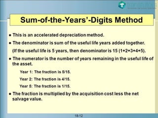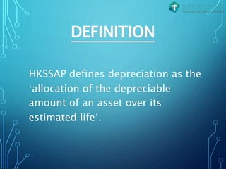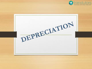 The document defines depreciation as allocating an asset's depreciable amount over its estimated life. Depreciation aims to match revenues and expenses to determine profit and spread an asset's cost over the periods it benefits the company. Depreciable assets are used for more than one period, have a finite life, and are held for business use. Non-depreciable assets include land and some investment property. Methods of depreciation include straight-line, units-of-production, and declining balance, with each calculating depreciation expense differently over the asset's estimated useful life.