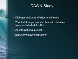 The document discusses the differences between depression and diabetes distress. Depression involves symptoms like changes in appetite and sleep, irritability, and thoughts of suicide. Diabetes distress refers to feelings of being overwhelmed, stressed, or upset specifically about aspects of living with diabetes, rather than clinical depression. The document also provides examples of feelings people with diabetes may experience regarding their disease, support systems, and treatment. It concludes by offering suggestions for addressing diabetes distress, such as seeking support and becoming more proactive in diabetes management.