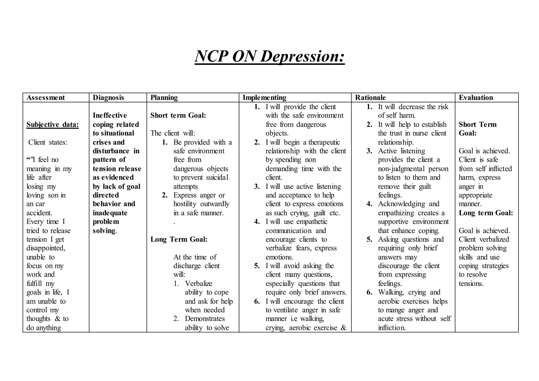The client, a 25-year-old woman, is experiencing depression after losing her son in a car accident. She feels no meaning in life, is unable to focus or achieve goals, and has suicidal thoughts. The nurse's goals are to provide a safe environment, help the client express emotions, and teach coping strategies. Interventions include active listening, encouraging expression of feelings, relaxation techniques, problem-solving training, and referral for counseling. The goals are for the client to safely cope with stressors and use problem-solving skills to resolve tensions.