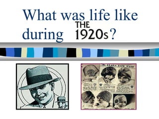 The document provides an overview of life in the 1920s and the Great Depression. It discusses the post-war culture of the 1920s including flappers, music, and new technologies. It then covers the stock market crash of 1929 and the economic issues that led to the Great Depression such as unequal wealth distribution and excessive buying on credit. The document concludes with a summary of President Roosevelt's New Deal programs aimed at relief, recovery, and reform to address the Depression.