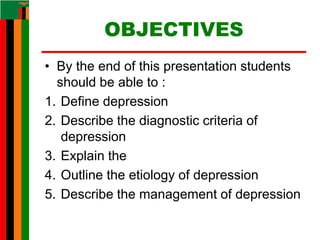 1. Defining depression and outlining the diagnostic criteria according to the DSM-IV, including symptoms such as persistent sadness, loss of interest, changes in appetite and sleep.