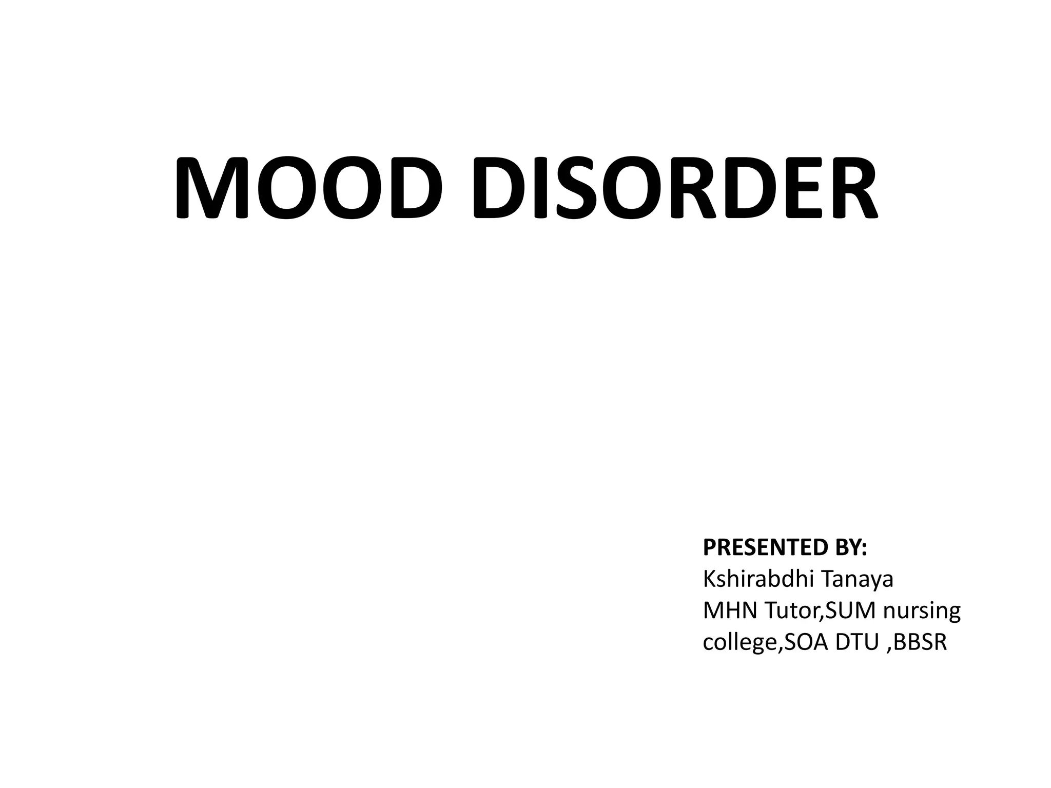 This document defines mood disorders and provides information on depressive disorders specifically. It discusses the classification, definition, epidemiology, types, diagnostic criteria and predisposing factors of depressive disorders. Major depressive disorder and persistent depressive disorder are explained in detail. The clinical features, diagnosis, treatment modalities and nursing management of depressive disorders are also summarized.