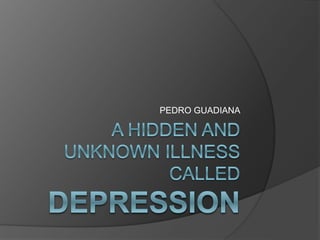 The document discusses the author's mother's experience with depression symptoms in 1999 which prompted the author to research depression. It then provides information on what depression is, types of depression, causes of depression including genetic, biochemical and environmental factors, common symptoms, and treatment options such as medication, therapy, exercise, nutrition, sleep, and social support.