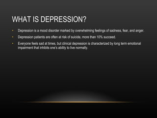 Depression is a mood disorder characterized by overwhelming feelings of sadness, fear, and anger. It affects people of all ages, races, genders, and economic statuses. Both genetic and environmental factors can contribute to depression. There are several types of depression including major depression, chronic depression, and atypical depression. Treatment options include medication, therapy, and social support. Famous people like Princess Diana, Harrison Ford, and Joker have suffered from depression.