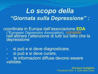 La Giornata Europea sulla Depressione 2010, coordinata dall'European Depression Association, mira a sensibilizzare sulla diagnosi e cura della depressione, affermando che il 5% della popolazione ne soffre. La depressione è una malattia complessa con fattori biologici, psicologici e ambientali, e richiede un approccio terapeutico integrato. È fondamentale il supporto della famiglia e una forte alleanza terapeutica tra psichiatra e paziente per garantire l'aderenza alla terapia e migliorare i risultati.