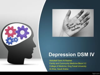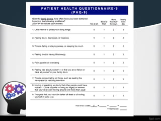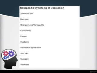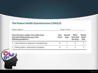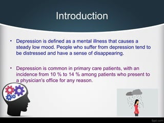 Depression is a prevalent mental illness affecting an estimated 350 million people globally, with significant implications for disability and disease burden. Common symptoms include depressed mood, loss of interest, and impaired concentration, with screening tools like the PHQ-2 and PHQ-9 aiding in diagnosis. Major depressive disorder (MDD) is diagnosed based on the presence of specific symptoms causing significant distress or impairment, following DSM-IV criteria.