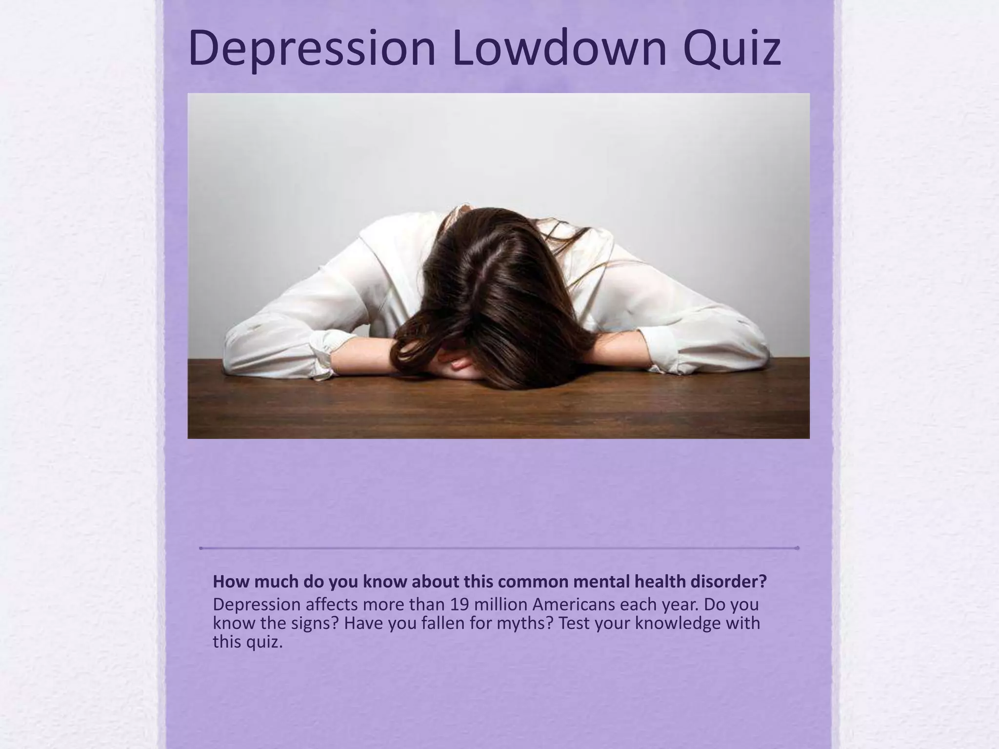The document presents a quiz to test knowledge about depression, a mental health disorder affecting over 19 million Americans annually. It addresses common misconceptions, outlines symptoms, and emphasizes that depression requires medical treatment, with significant improvement rates for those who seek help. The quiz also highlights the differences in prevalence between men and women and the distinction between depression and seasonal affective disorder.