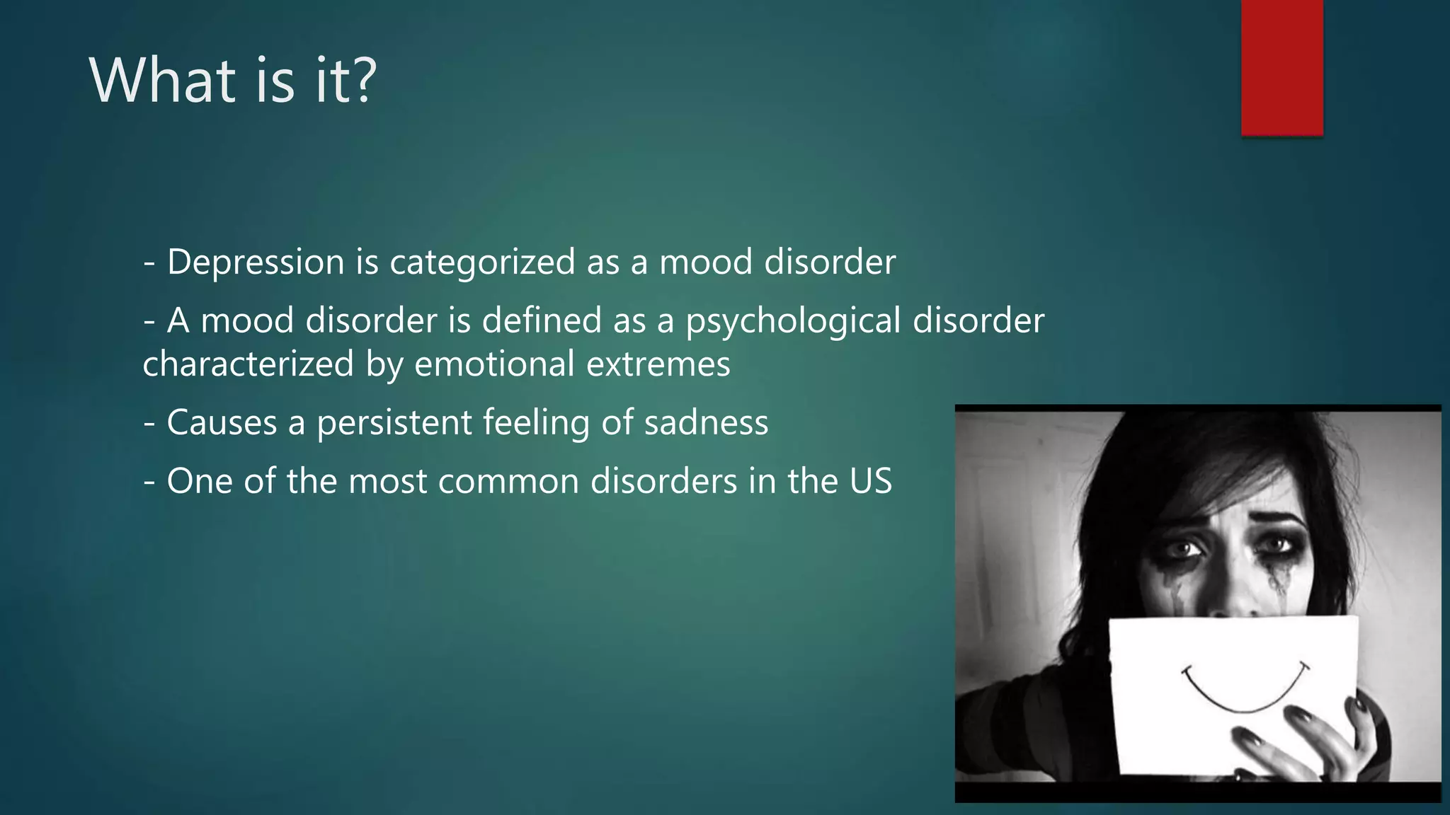 Depression is a mood disorder characterized by persistent sadness and emotional extremes, affecting approximately 6.7% of American adults. Factors contributing to depression include biological differences, chemical imbalances, traumatic events, and certain personality traits, with various types such as major depressive disorder and bipolar depression. Treatments include psychotherapy and antidepressants, and it is emphasized that depression can significantly impact physical health and quality of life.