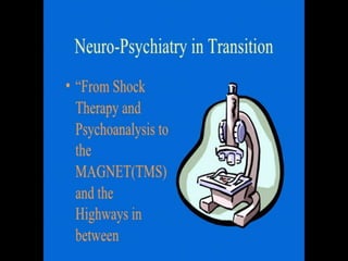 This document discusses depression, including its causes, symptoms, diagnosis and treatment options. It describes two main types of depression - exogenous depression, which usually follows traumatic life events, and endogenous depression, which is not associated with precipitating events and may be due to biochemical changes. Common symptoms of depression are then listed. The document goes on to discuss various treatment approaches for depression, including psychotherapy, electroconvulsive therapy, and several classes of antidepressant medications like SSRIs, SNRIs, TCAs, MAOIs and others. Side effects and mechanisms of action are provided for some of the antidepressant classes.