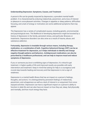 Depression is a common mental health issue characterized by persistent sadness, lack of interest in activities, and various physical and psychological symptoms. Its causes are complex, involving genetic, environmental, and psychological factors, and it can significantly affect daily functioning. Treatment options include therapy, such as cognitive-behavioral therapy, and medications, and early intervention is crucial for improving quality of life.
