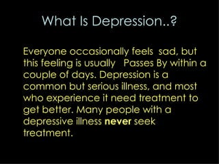Depression is the most common mental illness in North America, affecting around 15% of the population of developed countries. Depression causes daily difficulties and pain for those who have it as well as their loved ones. While depression affects women at higher rates, many depressed individuals, especially men and African American males, do not seek treatment due to personal weakness or embarrassment. Untreated depression can lead to symptoms like sadness, sleep changes, appetite changes, loss of interest in activities, fatigue, difficulty concentrating, and in severe cases, suicidal thoughts.
