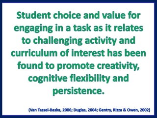 The document discusses differentiating instruction for gifted learners through depth and complexity. It defines depth as digging deeper into curriculum to focus on more difficult and abstract aspects of a discipline. Complexity is described as relating a topic to other disciplines, considering different perspectives, and broadening knowledge. The document advocates active learning approaches that provide gifted students opportunities to explore disciplines in greater depth and complexity through reflective thinking.