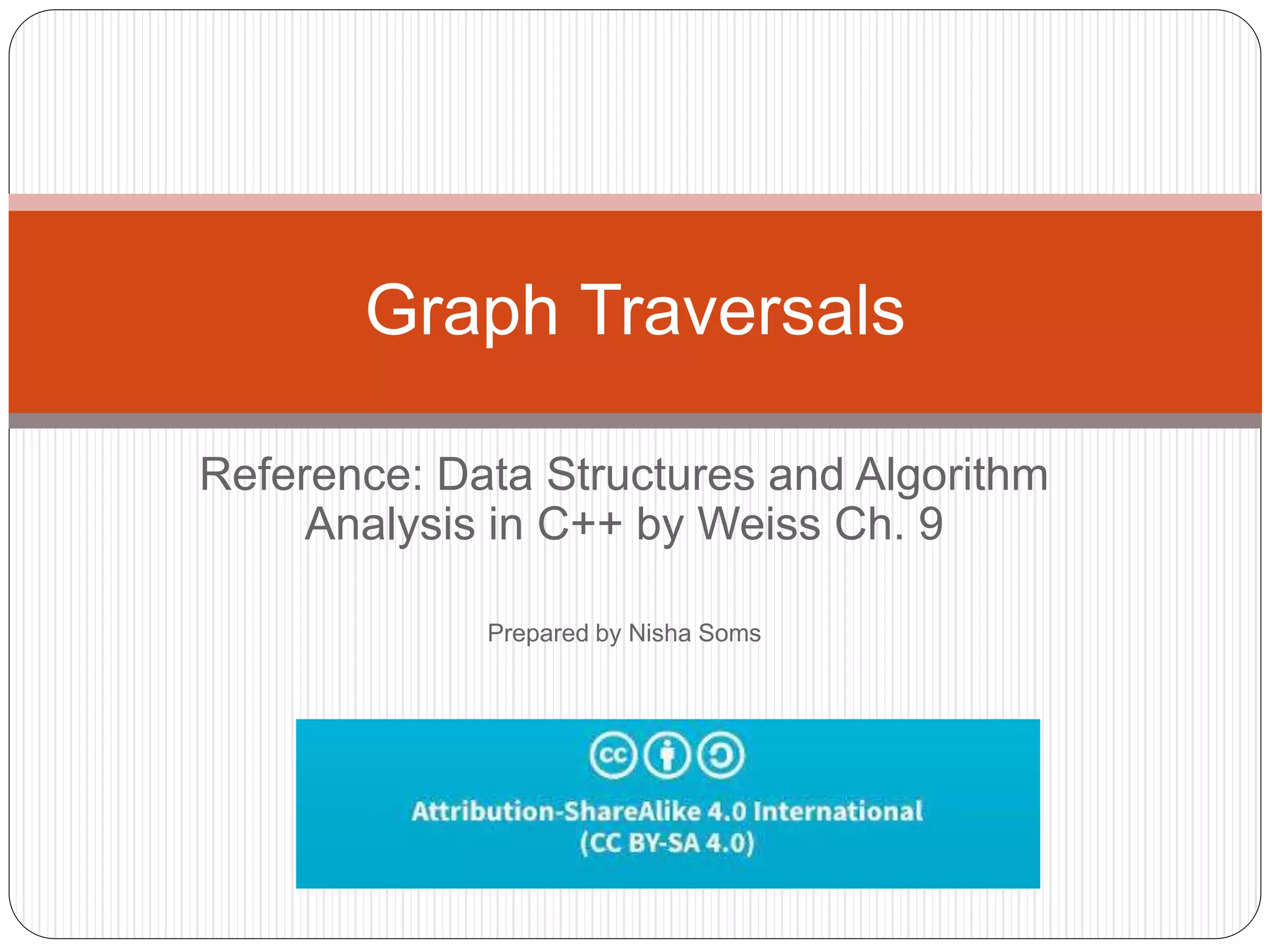 The document defines and provides examples of key concepts related to graphs and graph traversal algorithms. It describes what a graph is comprised of (vertices and edges), common graph types (directed/undirected, weighted/unweighted), graph terminology (degree, path, cycle, connectivity), and graph traversal algorithms like depth-first search (DFS) and breadth-first search (BFS). It provides pseudocode for DFS and BFS algorithms and analyzes their runtime and ability to find optimal paths.